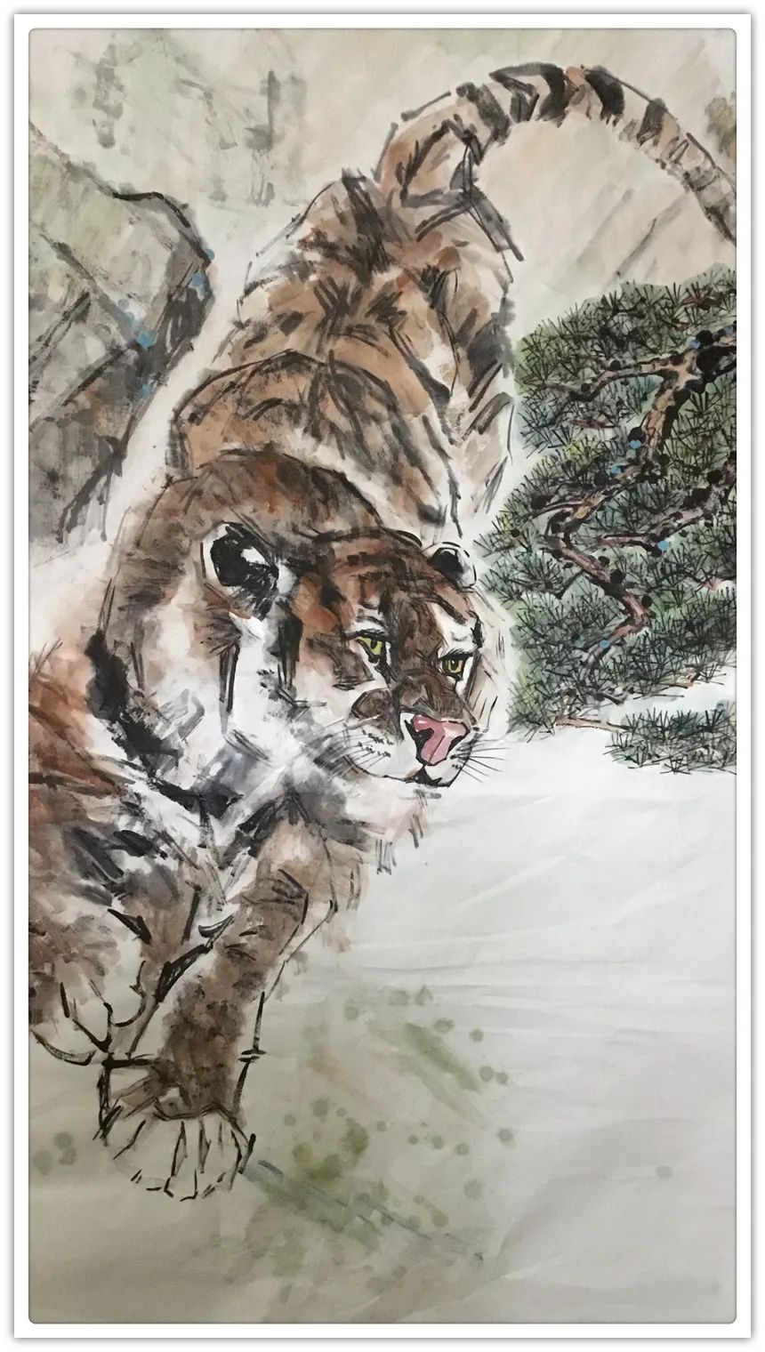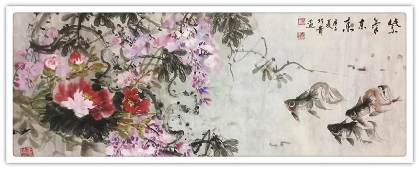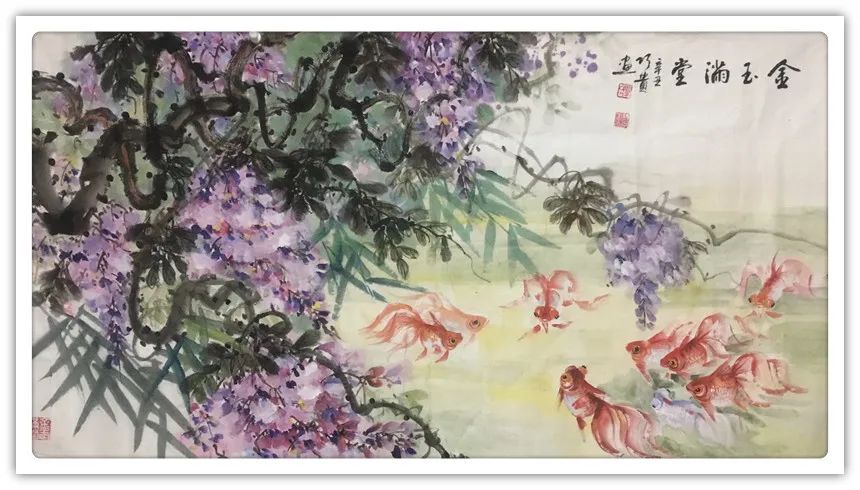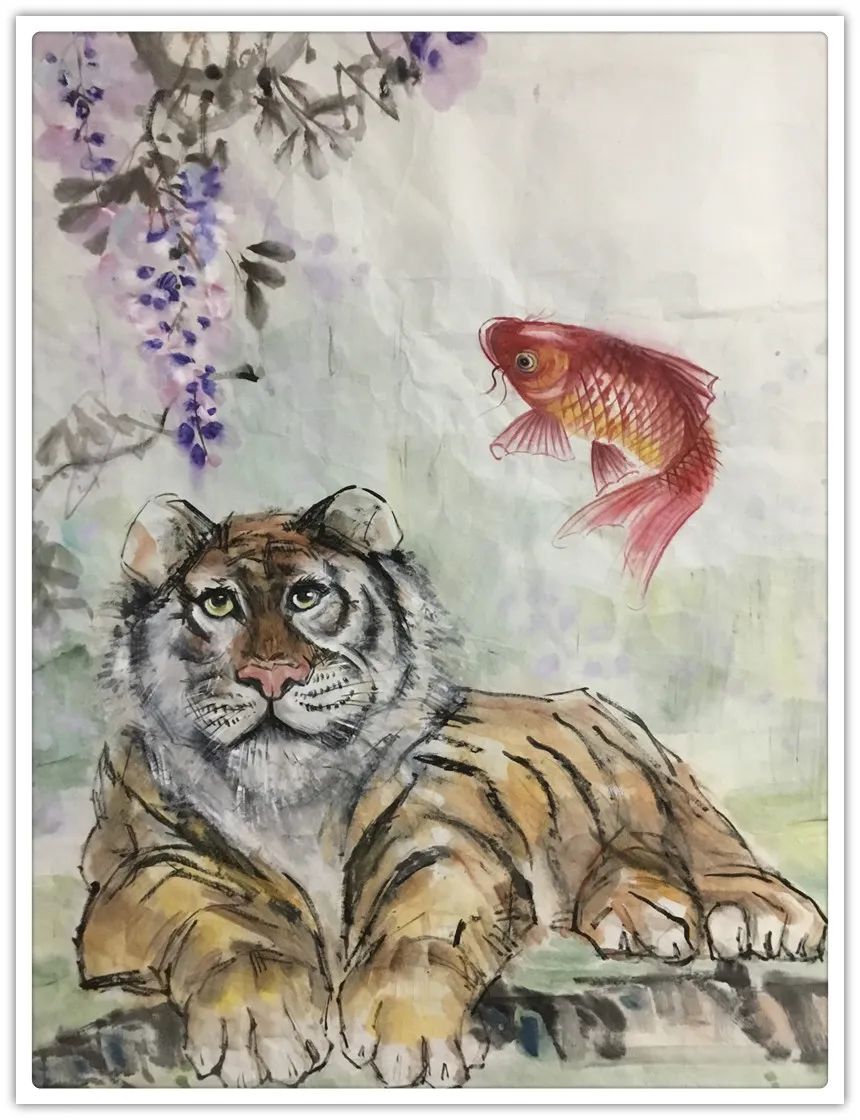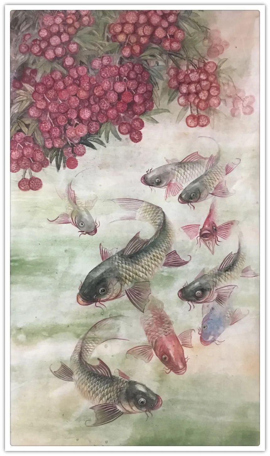 他画鱼,主取金鱼喻财和鲤鱼喻才而出色。金鱼的笔法造型,相当有个性,畅游水中,却不绘水纹,留白轻罩染渐色,生成云霞蒸蔚的意象,画鱼尾如燕翅,画鱼眼如龙目,画鱼鳞如金甲,神有龙威,浮如燕翔,衬托于紫滕蔓下,似是南海仙域聚财来,金运有余福气足,有很强的文化寓意性,也有很到位的装饰观瞻性,通灵动心,极是唯美。画鲤鱼,则是在动态的塑造上极显功力,逆水而跃的动感,超越近乎所有的鱼题画的构建水准,形成了极尽入目的势能,势能转化成跃生龙门成大才的张力,在姿态上引发着人们奋发向进的励志情怀,所以这种鲤鱼图,是真正的美术根子,也是全能的教化内涵,有形有态,有思有想,独注价值观,是笔墨随功时代的典范。