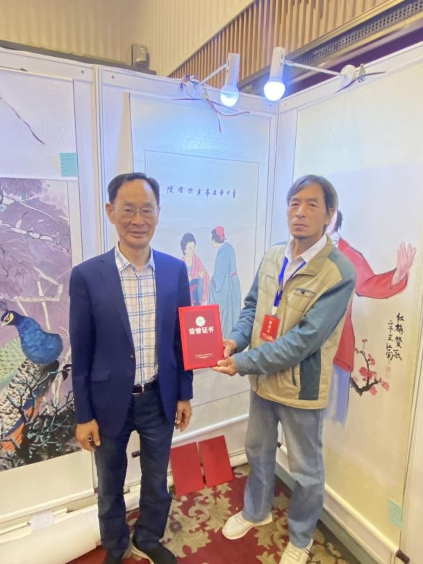 潘震宙部长(左)为画家段兰亭颁奖并合影留念