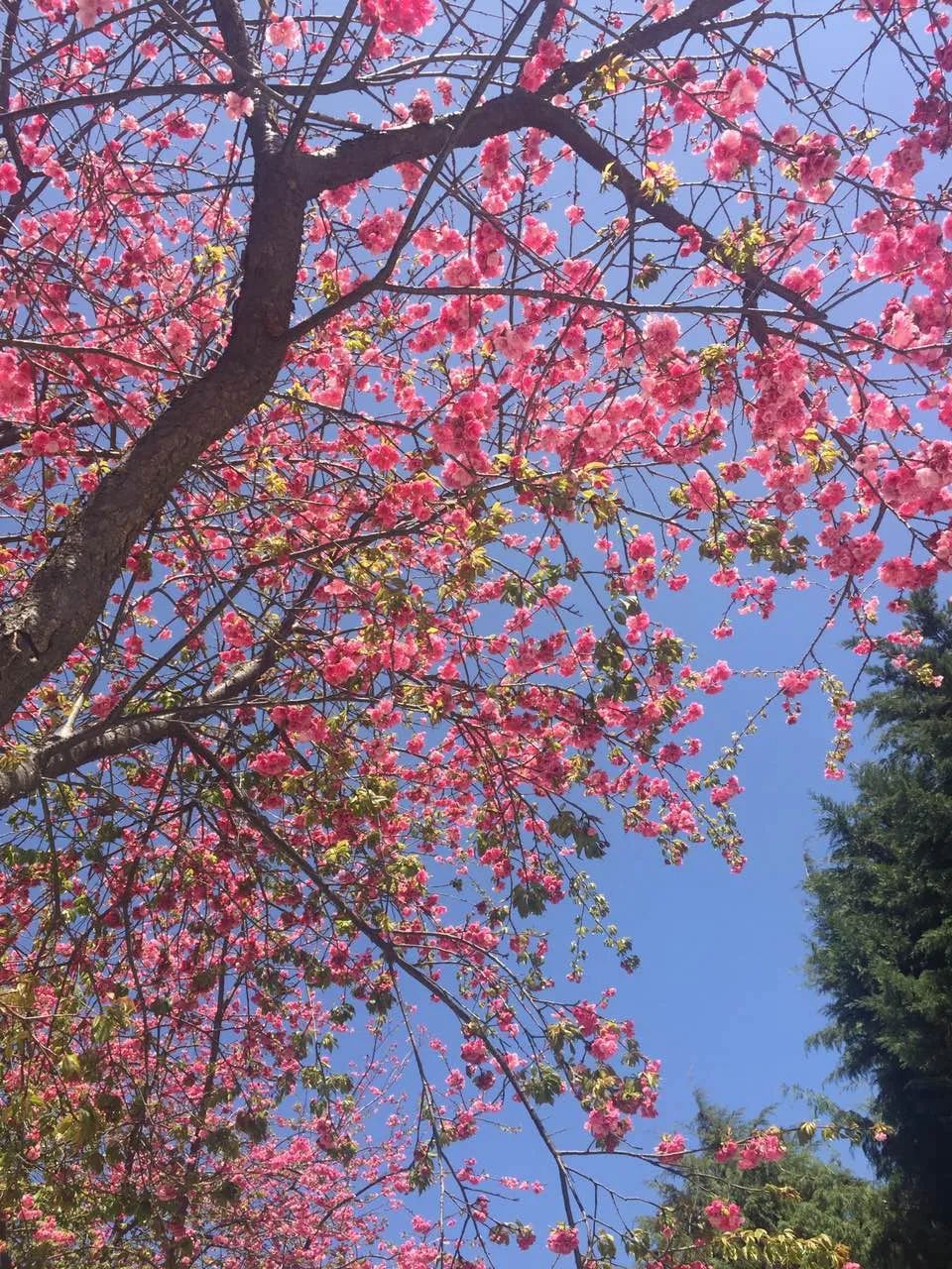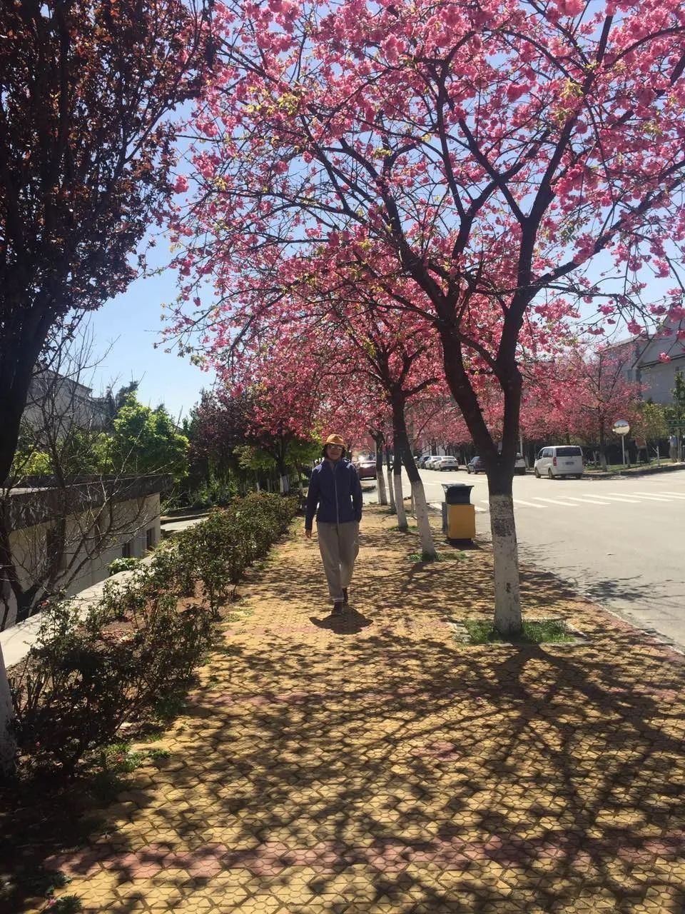 说到苍山,不得不说说苍山脚下的大理大学。大理大学的樱花是著名的,这个时候正是樱花季。相比北京的樱树,大理的樱树更高更壮观,花朵也更大更艳一些。大理大学的主干道两侧排列着整齐的樱树,粗壮的枝条上开满了茂密的樱花,花朵硕大,娇艳欲滴。路两侧的樱树齐齐的向上向外长,于高空中交织在一起,在湛蓝的天空下,为道路织起了一张樱红色的幔帐。缨树旁交互种着竹和柏,苍劲的绿更衬托出了樱的娇红。校园内亭台楼榭星罗棋布,鲜花绿植随手拈来,学生们三三两两的安静的走着交谈着,这不正是我梦中的校园吗?
