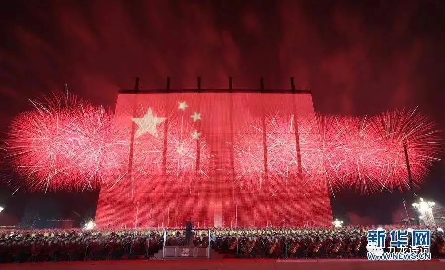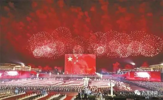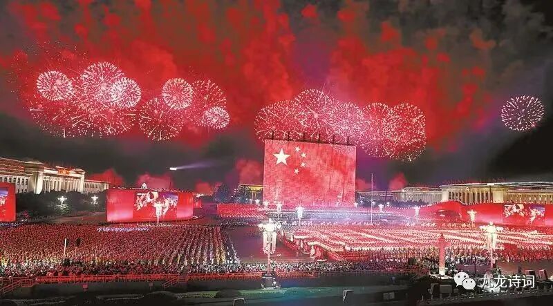 凤舞龙骧,庆祝国庆,环球聚焦。忆井冈星火,燎原映帜,延河帷幄,缚虎挥刀。日月翻新,妖魔荡尽,历雨经风步步高。迎挑战,正飞舟劈浪,猛气干霄。