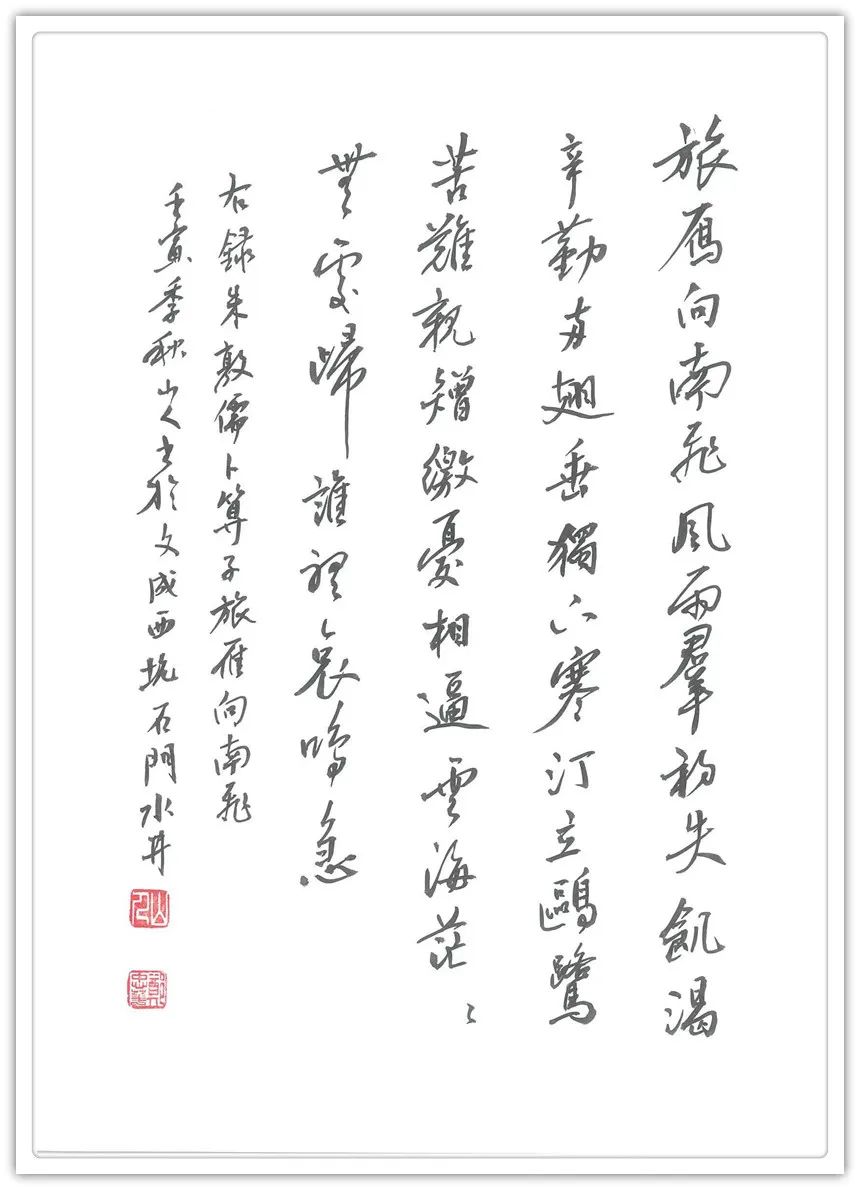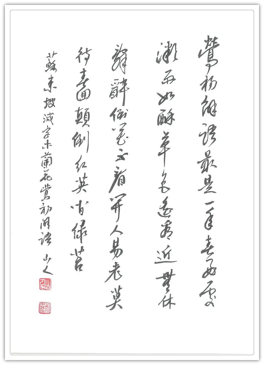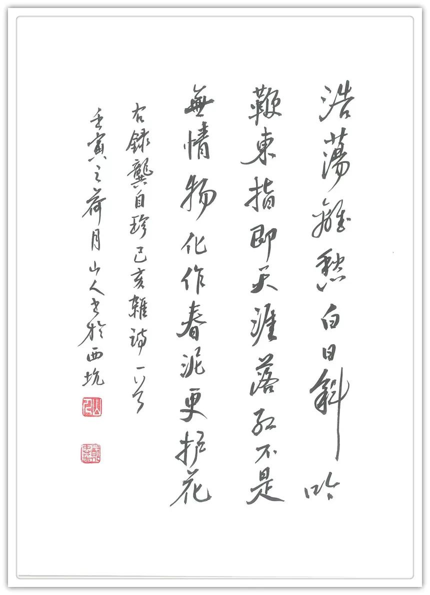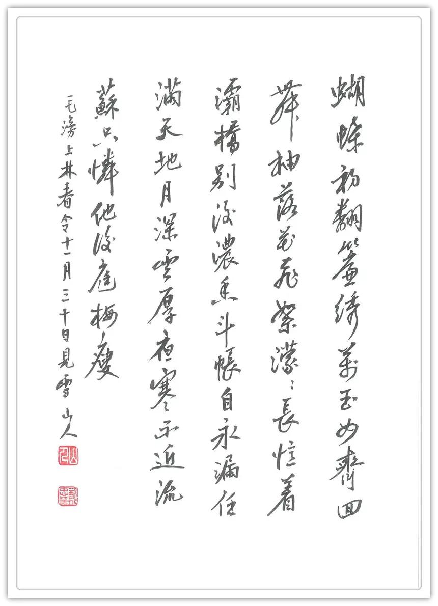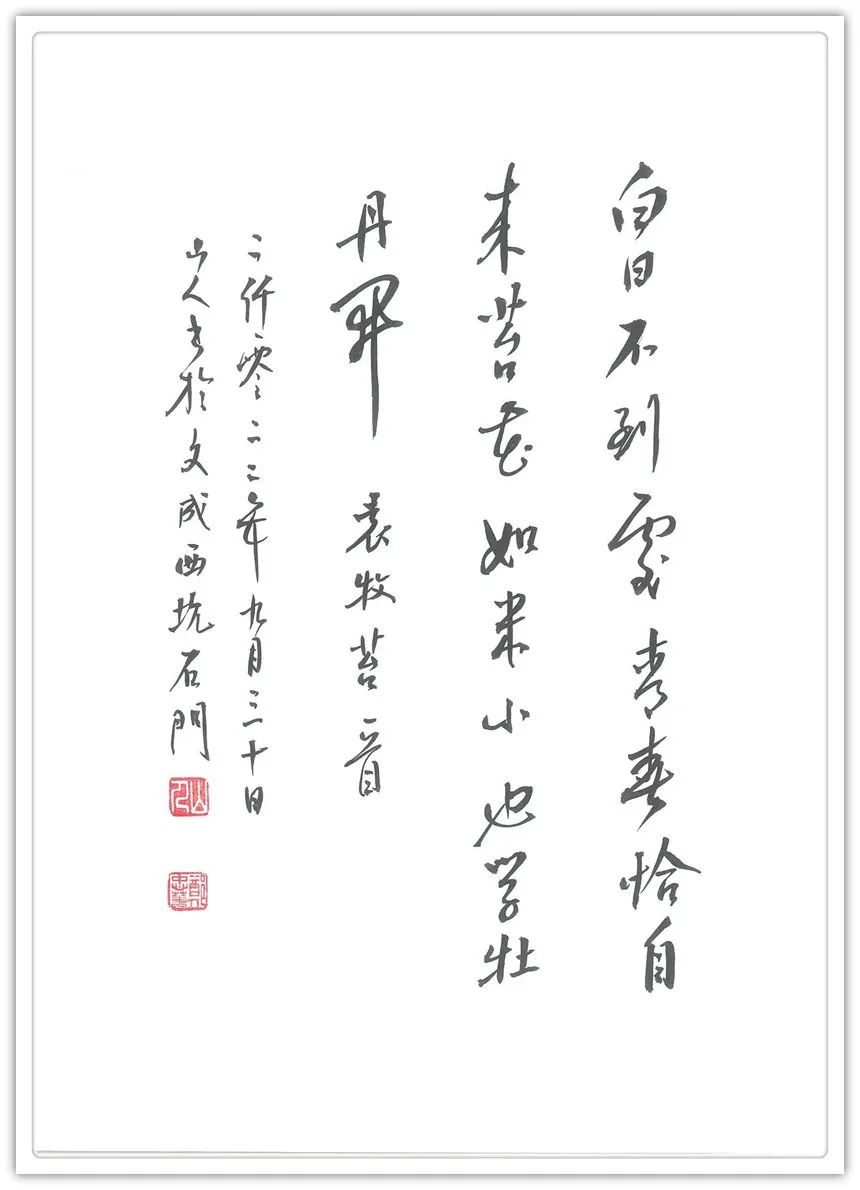 文人翰墨,天质自然。书法有法,法在碑帖。书法无法,法在心源。先生的书法是有法的正宗,亦是无法的自然。依靠文人修养的无量加持,可以激楚浪以成纹!不但笔法精湛,而且笔势多变,以力写书法,也循气写书法。笔未到气已吞,笔已离气未息,八面出锋,方圆周备,让书法极有龙跳天门,虎卧凤阙的审美冲击力。循气蓄势,势来不可止,势去不可遏,再加上墨色的丰枯变化,让书法表现出飘风骤雨惊竦竦的快利感,亦可以写出落花飞雪何茫茫的诗意感。文人书法,天质成诗意,道法自然!