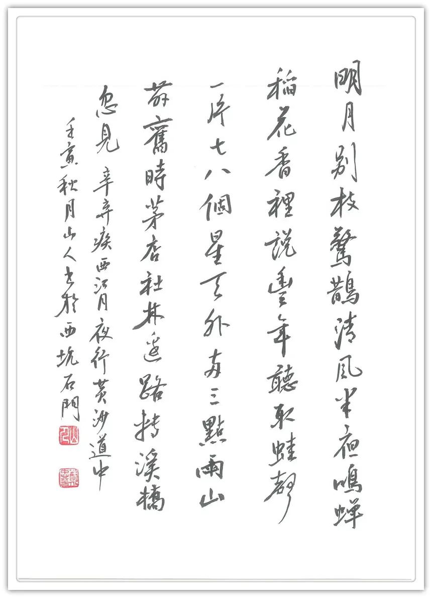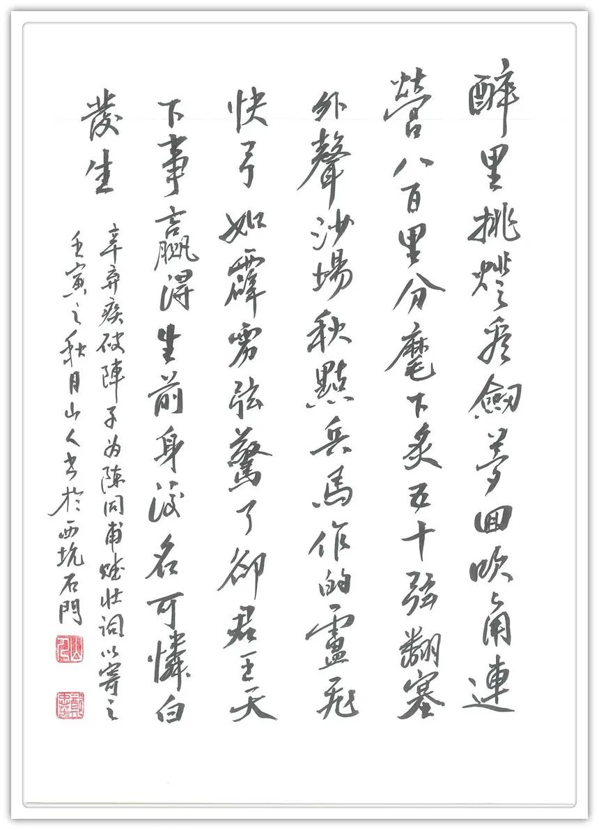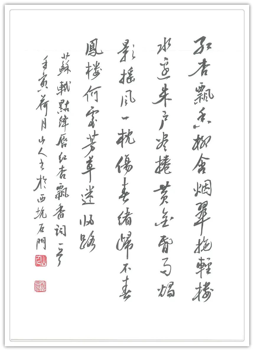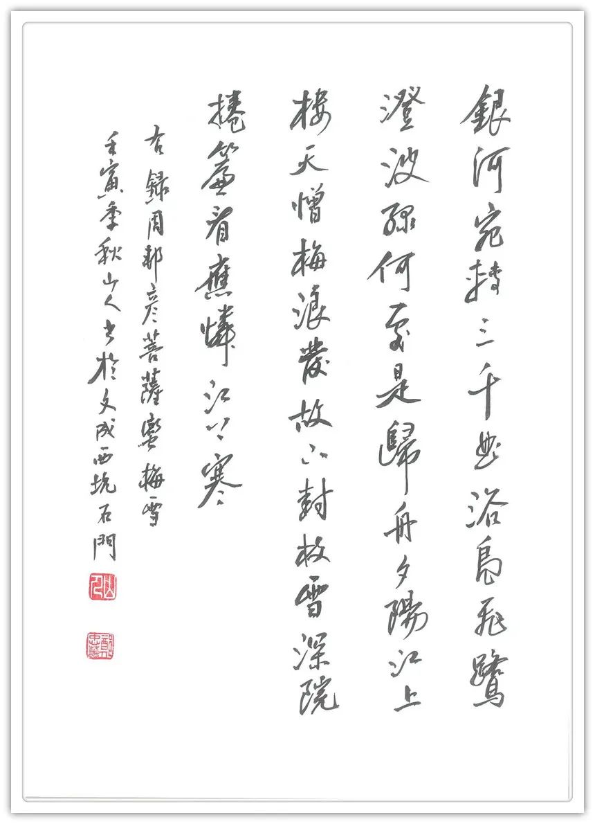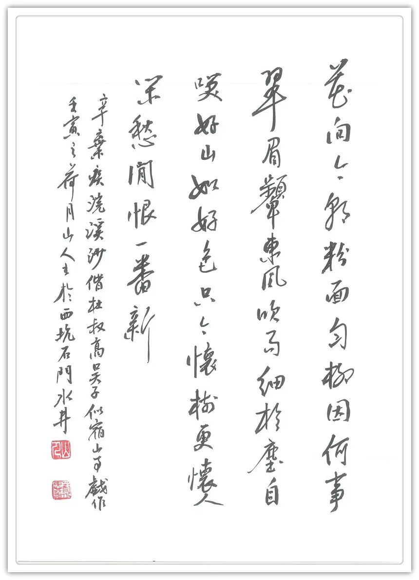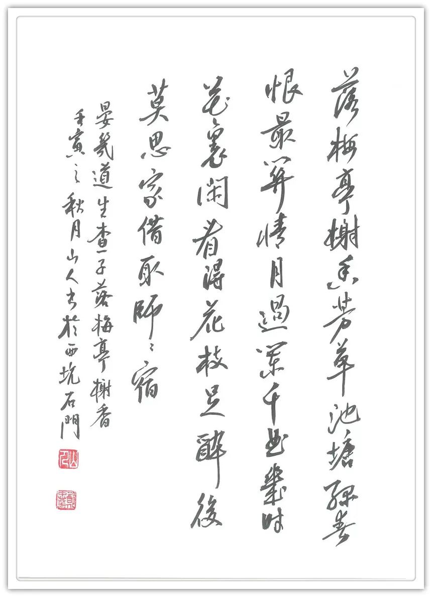 文人翰墨,天质自然。书法有法,法在碑帖。书法无法,法在心源。先生的书法是有法的正宗,亦是无法的自然。依靠文人修养的无量加持,可以激楚浪以成纹!不但笔法精湛,而且笔势多变,以力写书法,也循气写书法。笔未到气已吞,笔已离气未息,八面出锋,方圆周备,让书法极有龙跳天门,虎卧凤阙的审美冲击力。循气蓄势,势来不可止,势去不可遏,再加上墨色的丰枯变化,让书法表现出飘风骤雨惊竦竦的快利感,亦可以写出落花飞雪何茫茫的诗意感。文人书法,天质成诗意,道法自然!
