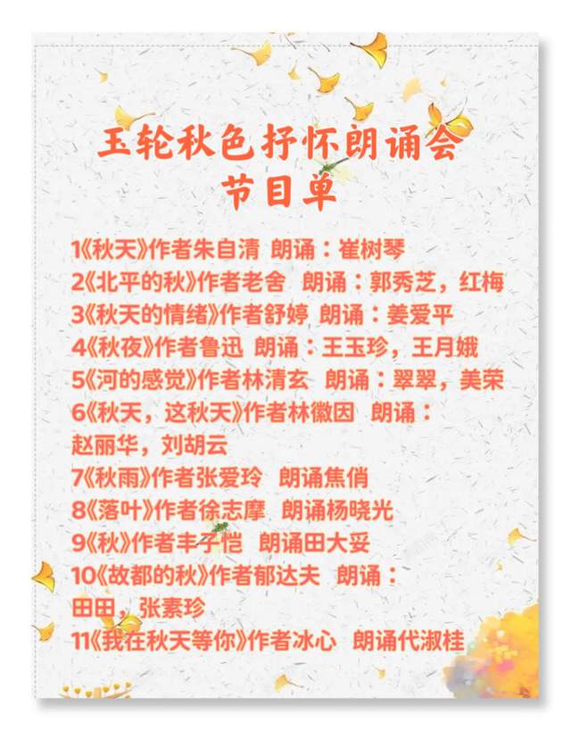 秋天的早晨格外清淡、宁静、光明,默默地给人以生机勃勃的活力。下面我们就以朱自清的《秋》,开启这场以秋为题的诗会。下面我宣布,玉轮秋色抒怀朗诵会现在开始。