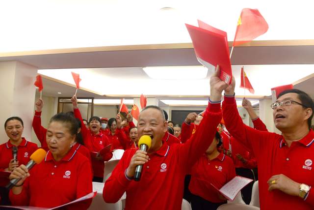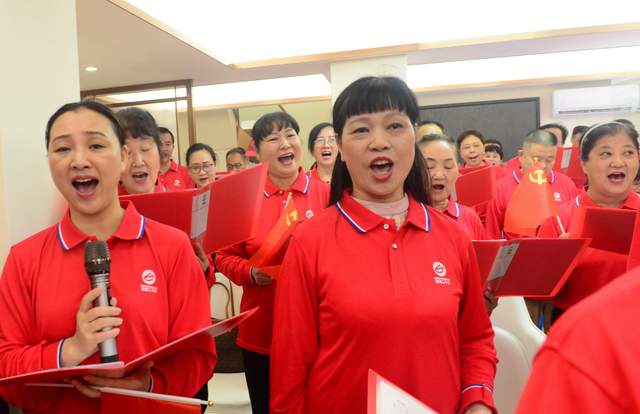 现场气氛热烈,社区居民高唱《鲜红的党旗 鲜红的国旗》