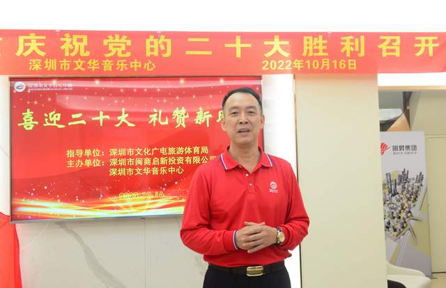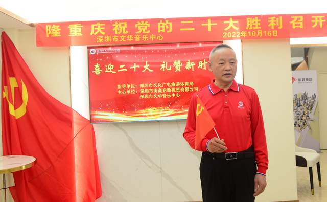 深圳市文华音乐中心理事长刘代禄表示,我们紧紧围绕“喜迎党的二十大”这一主题,大力开展理论宣讲、文化惠民志愿服务活动。今天,党的二十大的召开,我们非常激动,以务实举措和实际作为,推动党中央各项决策部署在基层落地生根、开花结果。创作《鲜红的党旗 鲜红的国旗》《中国红》等歌曲喜逢党的二十大隆重召开,作为老党员,我们更感荣誉和责任,我们要按照二十大精神的要求,学习宣传贯彻党的二十大精神是当前首要的政治任务,我们要按照二十大报告中提出的新目标、新任务、新要求,不断加强学习,坚定理想信念,明确责任担当,强化纪律作风,为开创新时代新业绩做出自己应有的贡献。