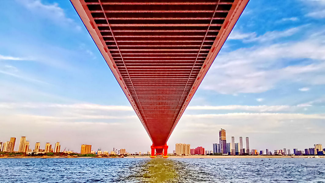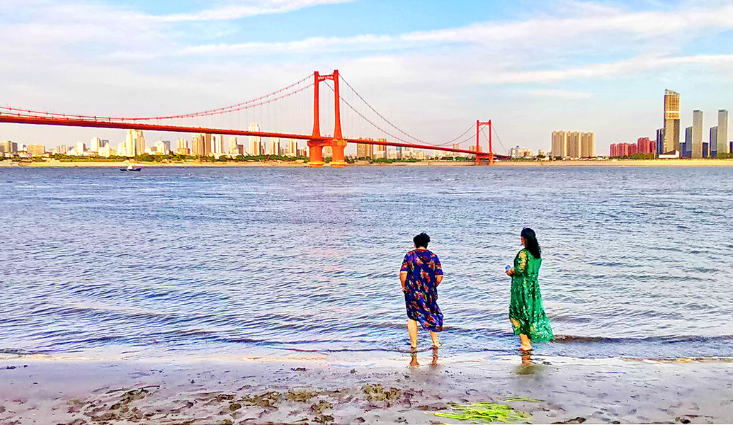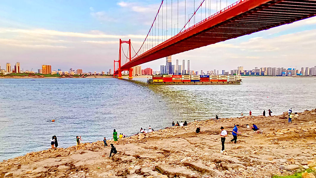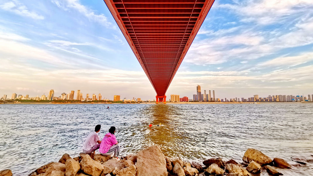 汉阳江滩,鹦鹉洲长江大桥下,前来透口气、观江景的人不少。这里景致不错,远望万里长江第一桥横卧江上,一江碧水东流,近处头顶就是鹦鹉虹桥。吹吹微风,闲情逸致,十分舒爽。(图文胡士明)