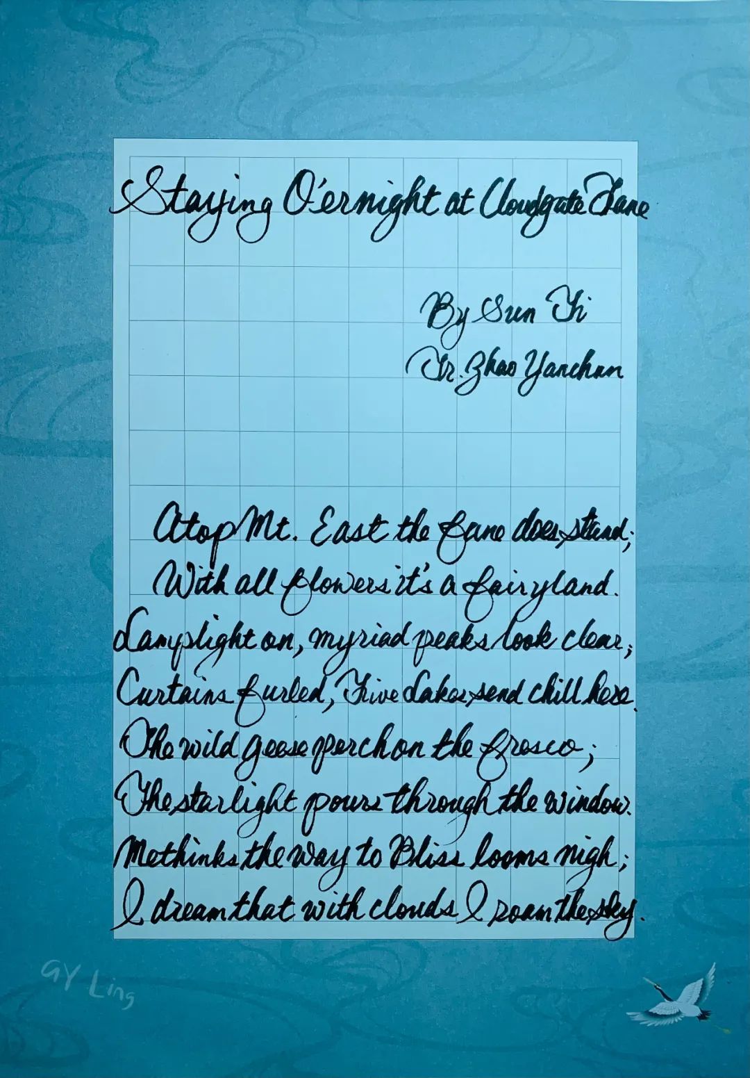 Staying O’ernight at Cloudgate FaneAtop Mt. East the fane does stand.With all flowers it’s a fairyland.Lamplight on, myriad peaks look clear;Curtains furled, Five Lakes send chill here.The wild geese perch on the fresco;The starlight pours through the window.Methinks the way to Bliss looms nigh;I dream that with clouds I roam the sky.
