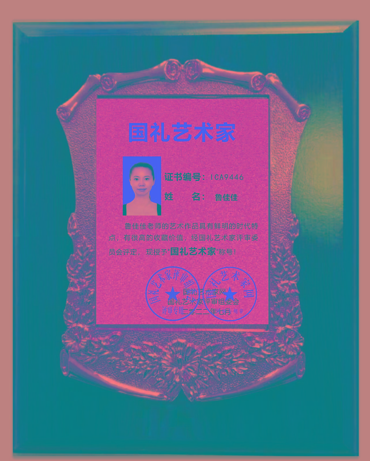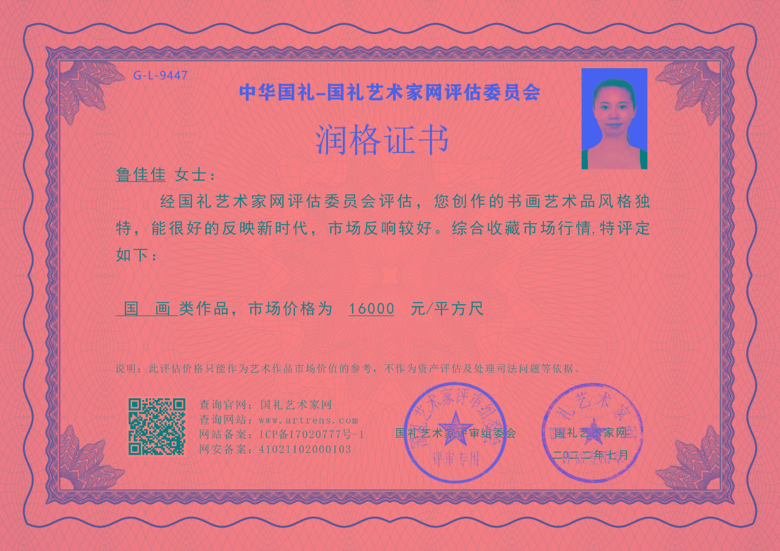 鲁佳佳,女,字梵青,汉族,生于1984年,毕业于:长沙理工大学艺术设计学院视觉传达专业,本科学历。户籍:江苏昆山市,现定居于中国上海。2022年7月加入中企艺联书画院个人理事会员,通过该机构将其及设计和创作的艺术作品推向国内外市场。现为中华国礼网国礼艺术家会员;书画家百科诚信认证个人会员;中企艺联书画院全国重点推荐国礼画家;艺术设计师;当代青年艺术家;国礼画家,高级设计师;高级插画师;美国世界艺术家协会(中国区)协会会员等机构颁发的荣誉资质和证书。