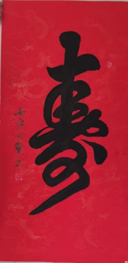 作品讲述:此作品以大红宣纸书写寿字,"寿”体现了人们追求长寿的共同愿望。根据中国传统观念,所谓人生有五福,寿居第一位。