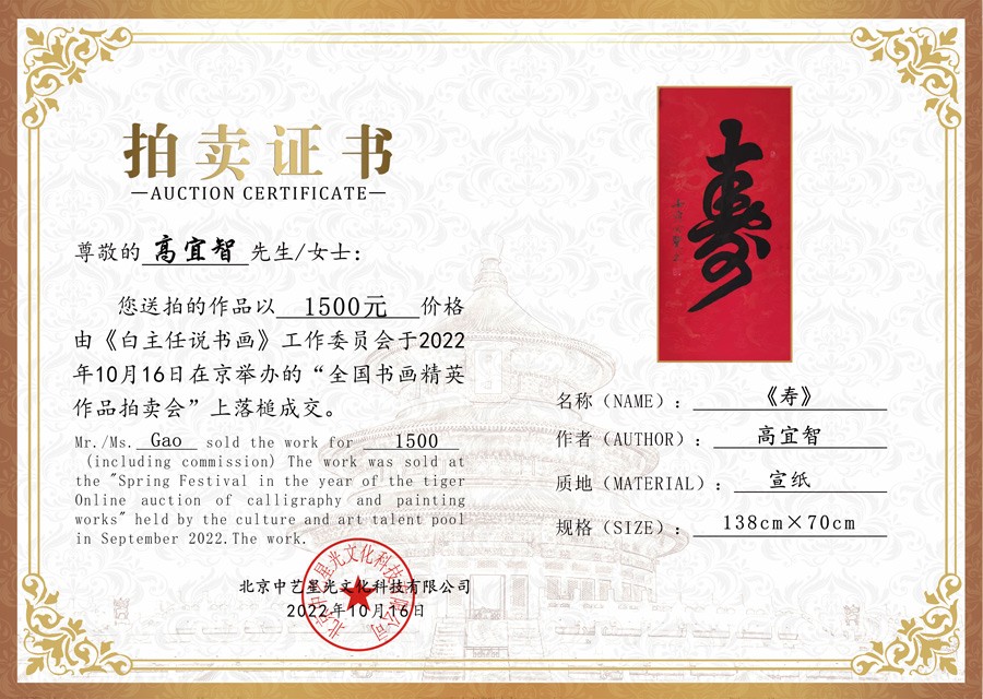 10月16日,由中国文化艺术人才库组织的“全国书画精英作品拍卖会第33期”在京举行,书法家高宜智的书法作品《寿》在多轮激烈的竞拍中以1500元被藏友收藏。