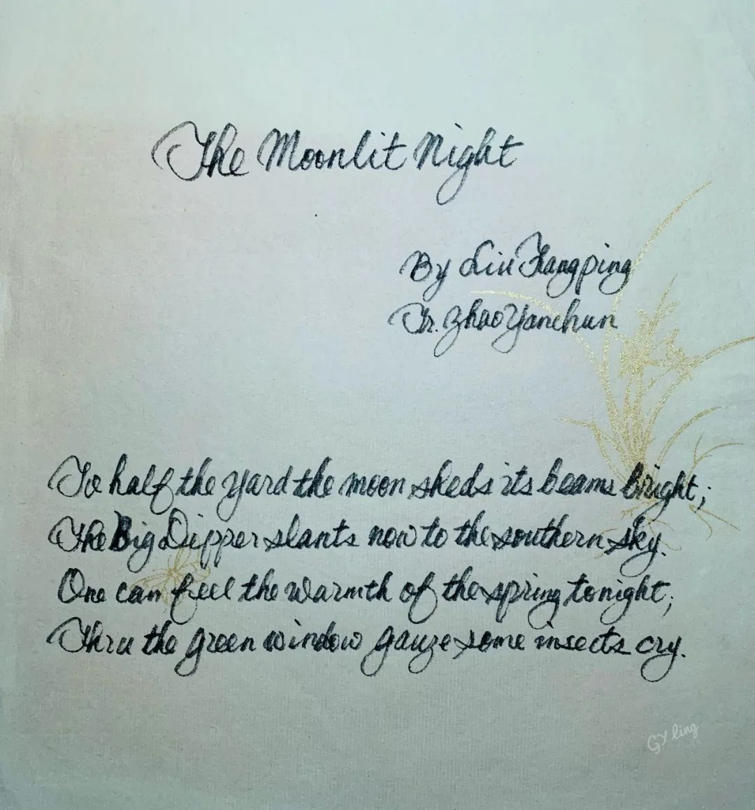 刘方平(生卒年不详),唐天宝年间诗人,洛阳(今河南洛阳)人。约公元七五八年前后在世,匈奴族。其《月夜(一作夜月)》《春怨》等为人传诵的名作。Liu Fangping (birth & death years unknown), a Hun Chinese, a native of Luoyang (present-day Luoyang, Henan Province). A poet during the Tlanbao period (742-756) of the Tang dynasty, he lived around 758. His masterpieces include Moonlit Night (or Night Moor) and Plaint in Spring (刘秀莲 译)