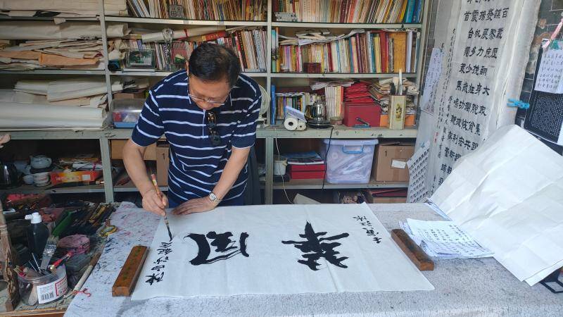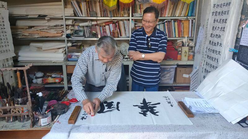 结束参观,准备离去。意外邂逅纪念馆老馆长——81岁的梁炳尧先生,一见如故。请教并试笔大书“风华”二字,有如神助,极为顺手,加盖梁老闲章。