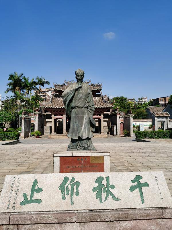 入江门蓬江区陈白沙纪念馆,迎面白沙铜像——拈须沉思、安静佇立;像前有湛若水手书一匾:千秋仰止。