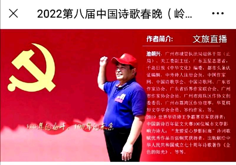 池朝兴,作品走进社区、学校、歌坛、书法、央视、国际的作家诗人;多篇作品发表或获奖于国内外书报刊杂志或网络;出版诗集《金色的希望》《金色的阳光》等。与人民同心,与时代同行,弘扬人间真善美。