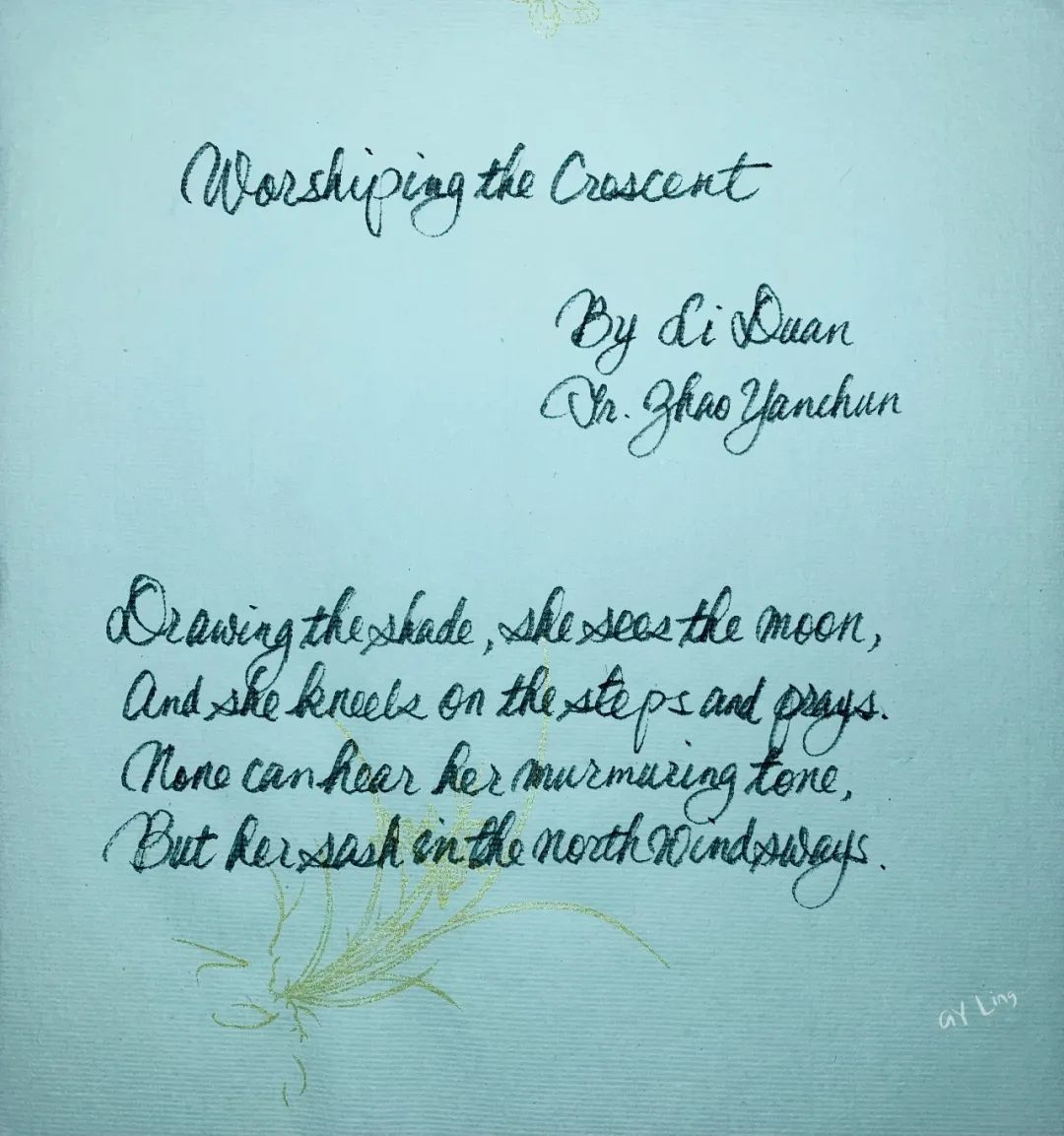 Drawing the shade, she sees the moon,And she kneels on the steps and prays.None can hear her murmuring tone,But her sash in the north wind sways.