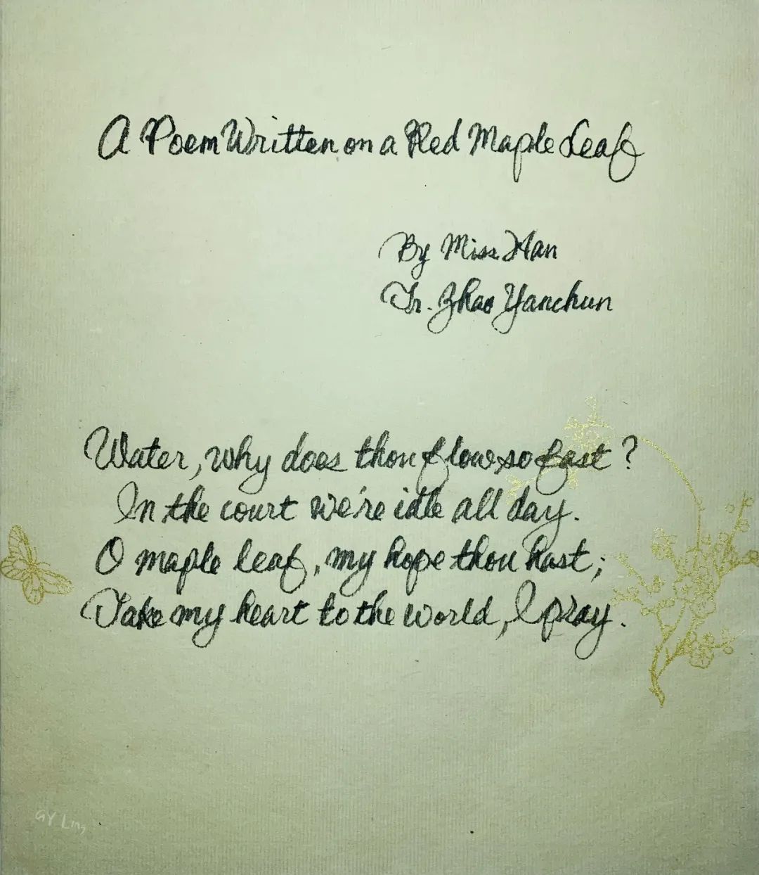 A Poem Written on a Red Maple LeafWater, why dost thou flow so fast?In the court we’re idle all day.O maple leaf, my hope thou hast;Take my heart to the world, I pray.