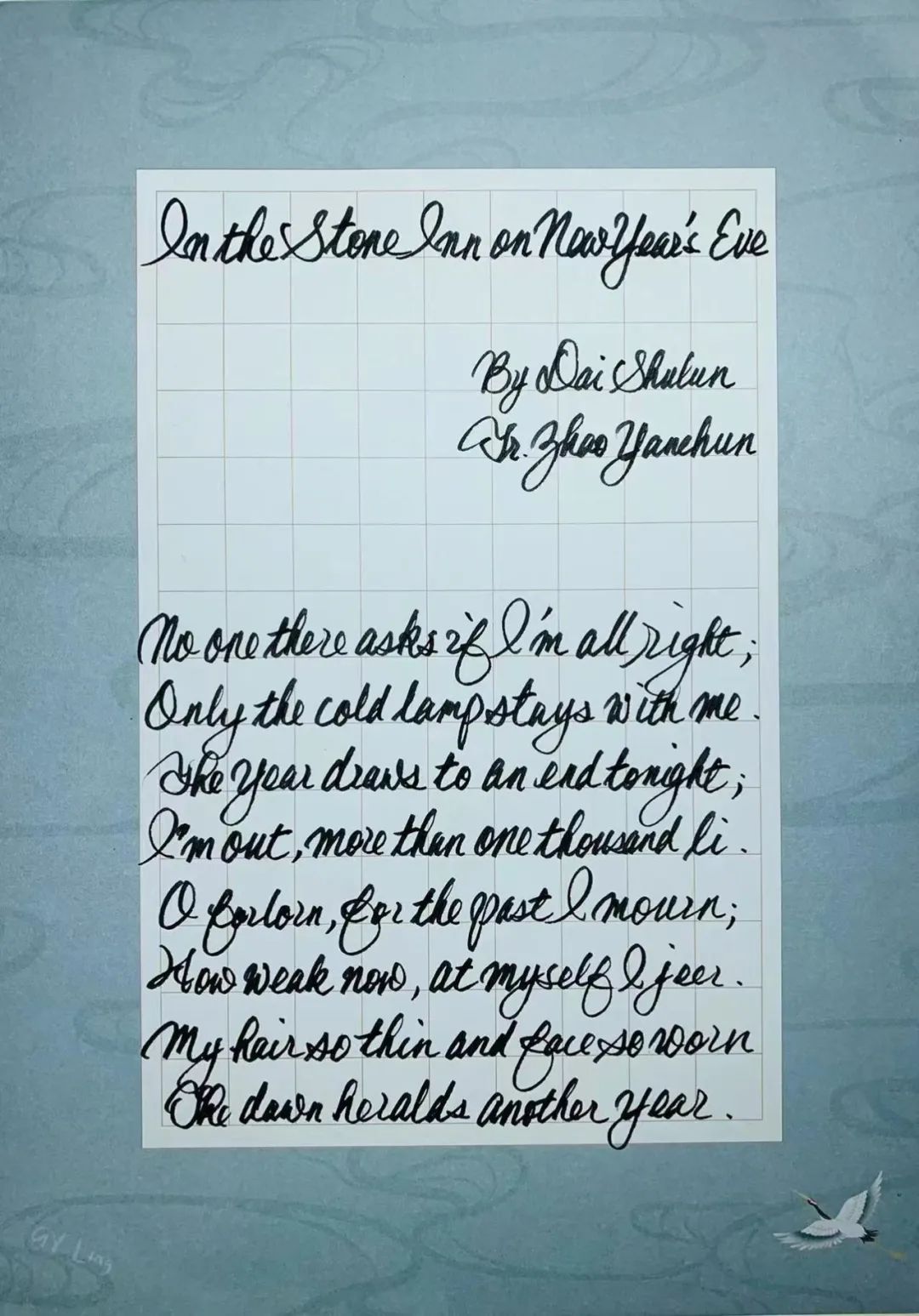 In the Stone Inn on New Year’s EveNo one there asks if I’m all right; Only the cold lamp stays with me.The year draws to an end tonight;I’m out, more than one thousand li.O forlorn, for the past I mourn;How weak now, at myself I jeer.My hair so thin and face so wornThe dawn heralds another year.