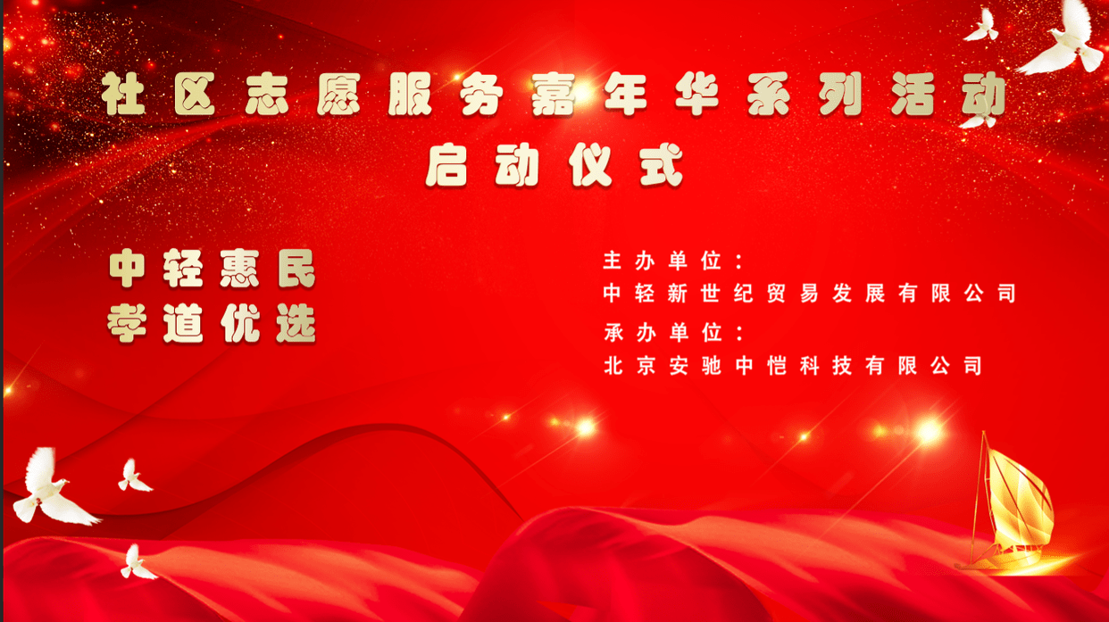 2022年11月11日,由中轻新世纪贸易发展有限公司主办、北京安驰中恺科技有限公司承办、北京扶老助残基金会执行的“中轻惠民孝道优选”社区志愿服务嘉年华系列活动线上启动仪式在北京成功举办。