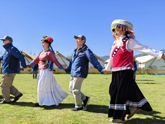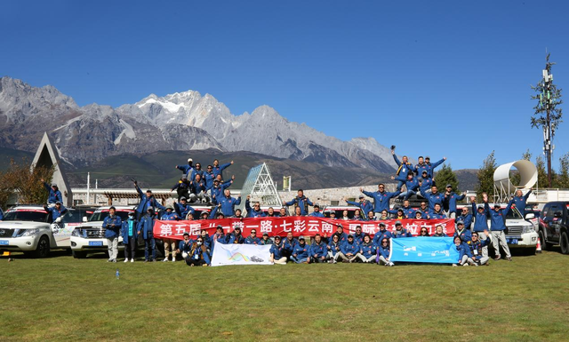 “香格里拉大道→束河路→东阳路→龙泉路→白水河段→旅游环线......”赛事一经开启,车队依次出发,驶进玉龙雪山风景区后道路左侧是巍巍高耸的玉龙雪山,在蔚蓝蓝天的映衬下尽显威武和神圣,道路右侧则是漫山翠绿的树木,绿水青山尽显生态优美。车队途经束河古城,成员拍照、打卡,感受古城浓厚的历史韵味。车队最终到达丽江东巴谷体育小镇,并在玉龙雪山东南山脚的绿茵草场上感受了纳西族人民热情的歌舞文化。