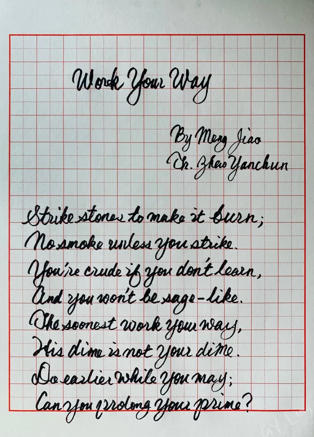 Work Your Way By MENG JiaoTr. ZHAO Yanchun Strike stones to make it burn; No smoke unless you strike.You’re crude if you don’t learn,And you won’t be sage-like.The soonest work your way,His dime is not your dime.Do earlier while you may;Can you prolong your prime?