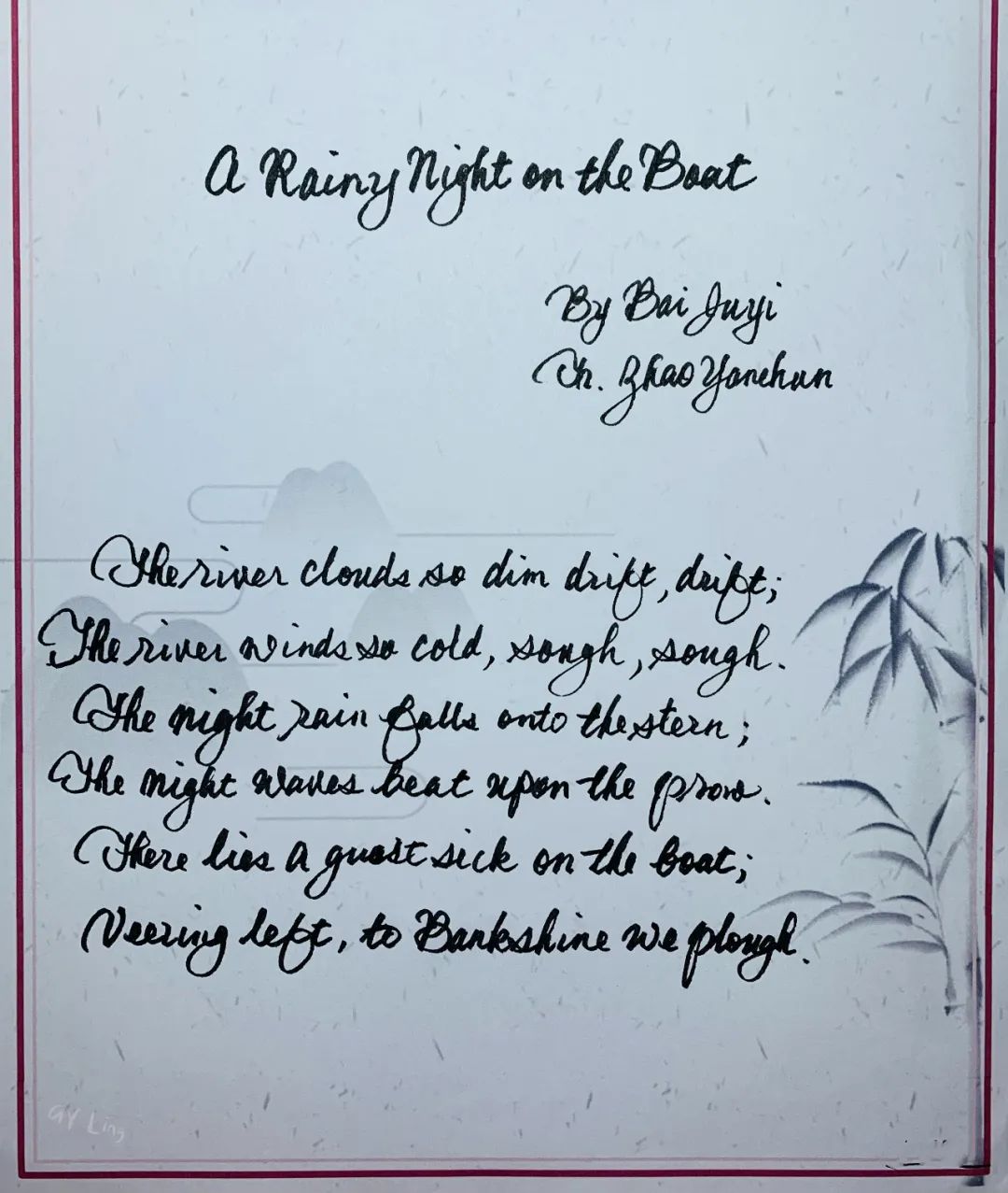 A Rainy Night on the BoatThe river clouds so dim drift, drift;The river winds so cold, sough, sough.The night rain falls onto the stern;The night waves beat upon the prow.There lies a guest sick on the boat;Veering left, to Bankshine we plough.