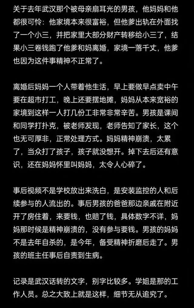 她不明白,从前那个温馨和善的家如今怎么会变得支离破碎。当所有人都在指责她不该将儿子的自尊弃之敝履时,没有人知道,在此之前,她都经历了怎样的事情。在一片温柔乡中,锐锐的父亲一时间迷了心窍,竟然把家中的大部分财产都悄悄转移到第三者的名下。原本锐锐父亲想过一段神仙日子,不料,小三偷偷卷钱跑路。散尽家财后的张父悔不当初,张母也一气之下选择和丈夫离婚。从养尊处优的境地变成了每天为生计发愁的单亲妈妈,张母只能独自一人抵挡着世间的风雨。天不亮就开始卖早点,下午要赶到超市打工,晚上还要出去摆地摊贴补家用……如今,最心爱的儿子走了。张母的心就像是一片长满荒草的废墟,即使再怎么浇灌,也不能恢复一丝生机。然而,就在张母一病不起,日日活在悔恨中不能抽身时,锐锐的爸爸竟然带着一众亲戚,在学校门口声讨。锐锐在世时,父亲不曾给他一个圆满的家庭,而在他死后,父亲却要挟学校赔偿一笔不菲的赔偿金。沉浸在丧子之痛中的张母几次想轻生来了结生命,这位已经“死过”两次的妈妈早已不能承受这一切的痛苦。她的精神越来越恍惚,朦胧间,她无数次地回想起倒在血泊中的锐锐,他用虚弱地声音一遍遍呢喃着:“妈妈,妈妈……”最终,饱受折磨的张母带着对锐锐的愧疚与思念,离开了人世。对于张母我们无需再去指责,但对于怎样和青春期的孩子相处,从这件事中我们也许能找寻到一些方法。麦家曾说:“陪伴青春期的孩子,说得难听一点,就是陪伴一头老虎,你得小心翼翼。”处于青春期的孩子,不仅自尊心极强,更是有自己的想法和立场。用针尖去对麦芒,必然会两败俱伤。03.