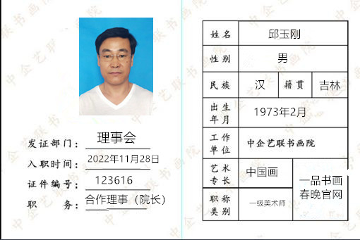 邱玉刚,男,祖籍吉林,汉族,生于1973年,自学中国画专业,研究生学历,网络作家,书画鉴赏师;客座副教授;国家一级美术师;中华国礼艺术家;中国艺术家协会书画研究会理事;中国书画家协会副会长;书画中国频道等全国百家网络媒体全国重点推荐艺术家;自2022年11月28日起任中企艺联书画院院长院长职务。