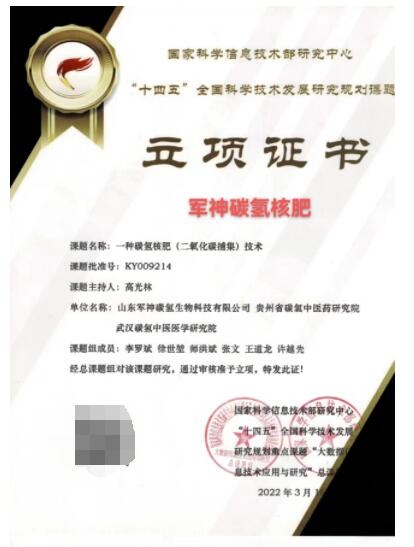本网11月30日讯 近日,山东军神碳氢生物科技有限公司“一种碳氢核肥(二氧化碳捕集)技术”,立项列入国家科学信息技术部研究中心“十四五”全国科学技术发展研究规划课题。