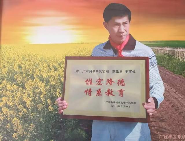 广南县莲城镇北宁中心学校,当年学校的入校路段是一段泥巴路,晴天一身灰,雨天一身泥……后来,学校找到陈佳林,希望得到支持,解决学生行路难问题。陈佳林二话没说,爽快投资修建入校道路——那一年,他41岁,一头青丝,目光坚定,脸上洋溢着温暖的光芒。