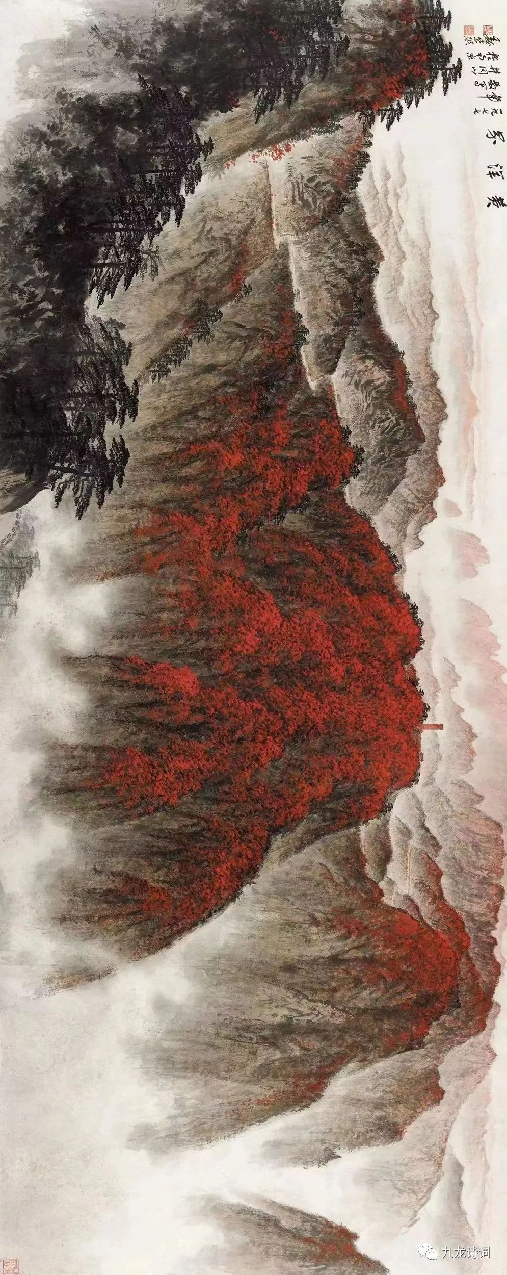 赭红叠彩千重浪,岁岁金秋响杜鹃。