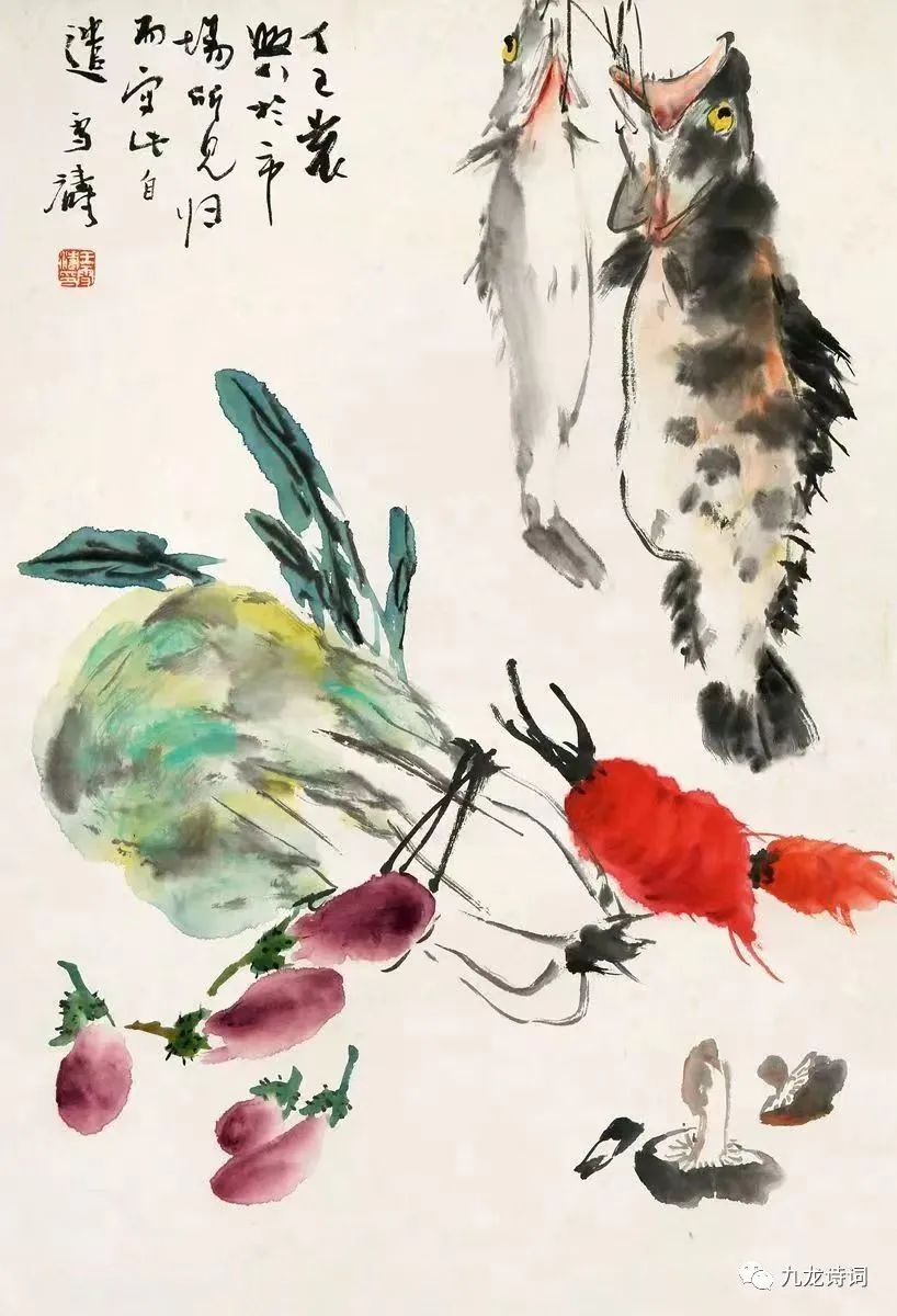 青蔬鲜,花鲫欢。作意逛农市,凝情流笔端。丹青精妙传今世,有滋有味亲民间。