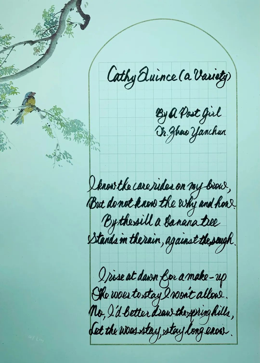 驿卒女, 南宋人,被陆游纳为妾, 半年被逐。存词一首,即代表作《生查子(又一体)》。A Post Girl of the Southern Song dynasty, taken as a concubine by Lu You (1125-1210, a poet in Southern Song dynasty) and expelled in half a year. Her representative work Cathy Quince (a Variety) was the only one existent.(肖文婷 译)