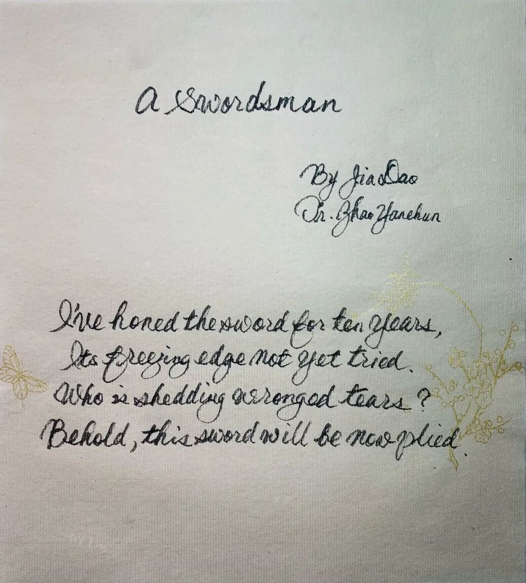 I've honed the sword for ten years,Its freezing edge not yet tried.Who is shedding wronged tears?Behold, this sword will be now plied.