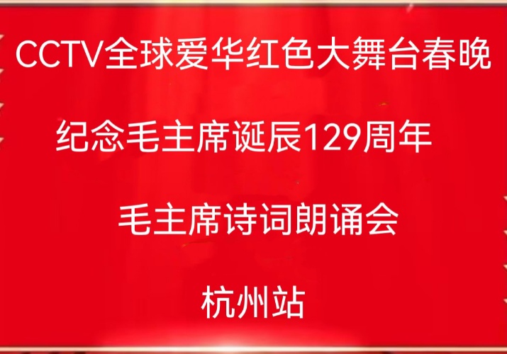 本网讯(王振磊)CCTⅤ全球爱华红色大舞台春晚,纪念毛主席诞辰129周年毛主席诗词朗诵会(杭州站),于2022年12月26日在线上(受疫情影响)如期举行!