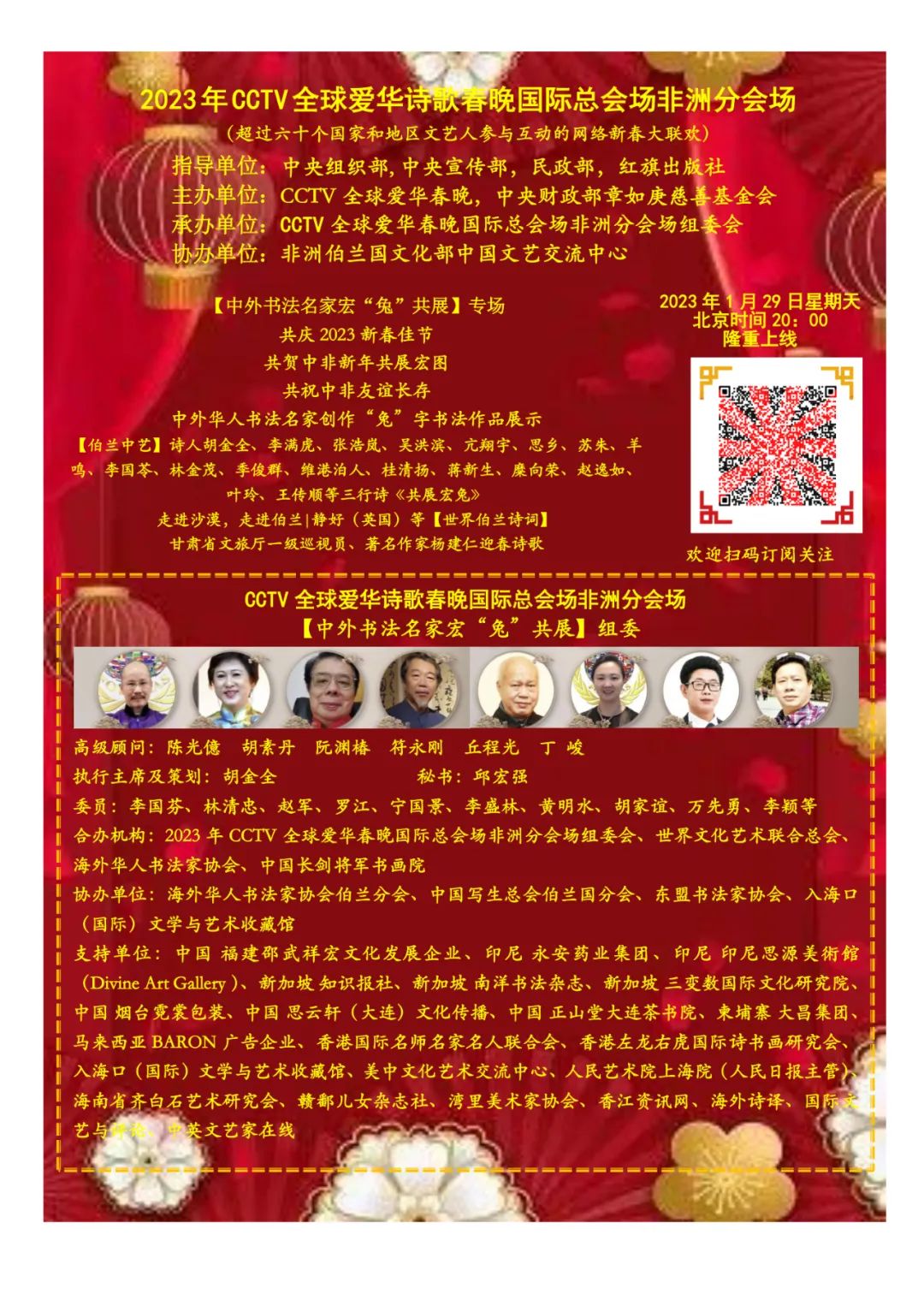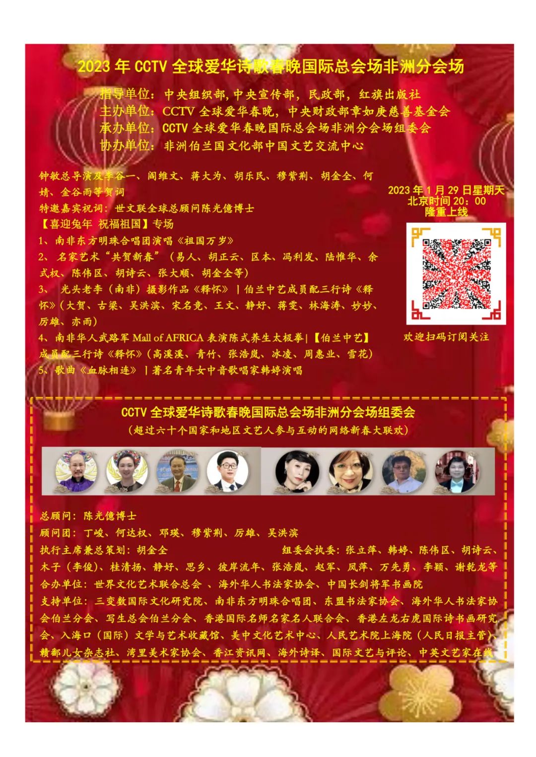 本节目预告为2023年CCTV全球爱华诗歌春晚国际总会场非洲分会场执行主席胡金全发布