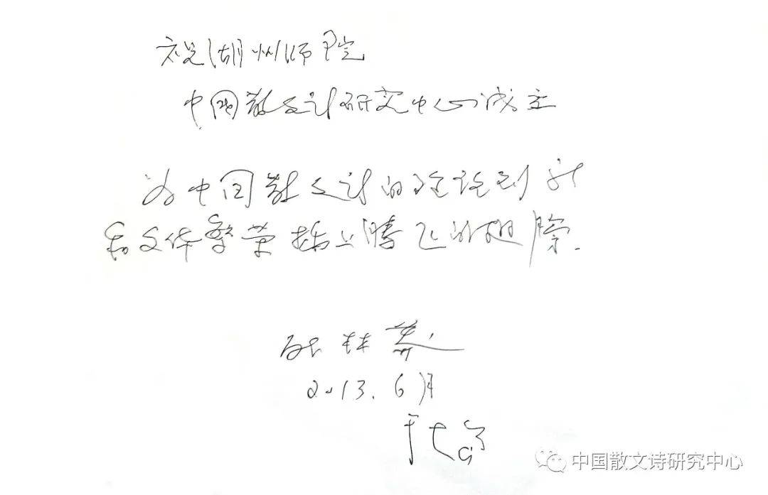 第二大贡献在理论上。他虽然没有系统的散文诗理论专著,但他30多年间发表了大量的散文诗专论,是对当代中国散文诗理论建设的重要贡献,对散文诗的繁荣发展产生了重要影响。他的文章有一个很大的特色,就是紧密联系散文诗创作现状和个人创作实践,有很强的针对性和启示性。他是散文诗文体诗性特征的坚守者。他认为:“散文诗本质上是诗,是诗的发展和延伸,是她的一个支脉或变体。”“散文诗是格律诗向自由诗过渡后的必然发展,也是现代口语成为诗的主要语言资源后的必然发展。”他强调,“散文诗文体的关键因素是'诗性',以之为其定性,便是天经地义的了。从'散文诗'的命名也可看出,'诗'是定语,其本质是诗,一目了然。散文诗、自由诗、格律诗,不过是诗谱系中的不同分支而已。”