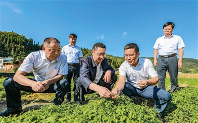 陕西省平利县委书记杨军(右三)到绞股蓝产业基地夏季调研。
