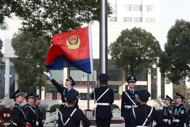 上午10时,50名参加仪式的公安民警身着警礼服,整齐列队、警容严整。护旗方队迈着矫健的步伐护卫警旗走向升旗台。在庄严的《中国人民警察警歌》乐曲声中,升旗手将警旗奋力挥展,代表着忠诚和守护的中国人民警察警旗冉冉升起、迎空飘扬。全体民警肃立注目,向警旗致以崇高的敬礼,并齐声高唱《中国人民警察警歌》。
