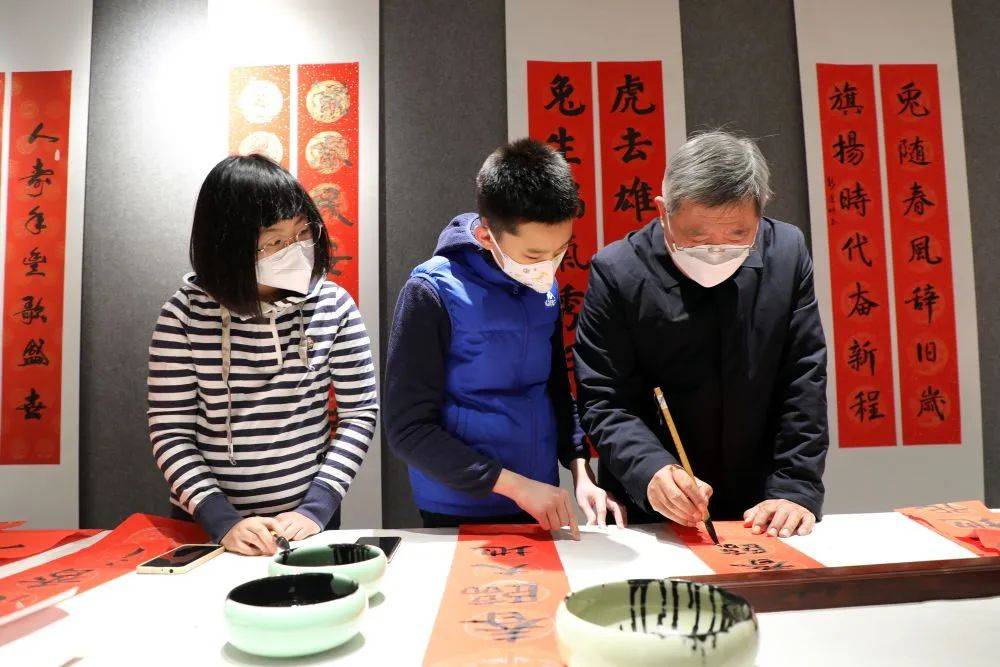 ↑1月9日,在石家庄市刘金凯书法家工作室,书法家刘金凯(右)指导书法小学员写春联。新华社记者 骆学峰 摄