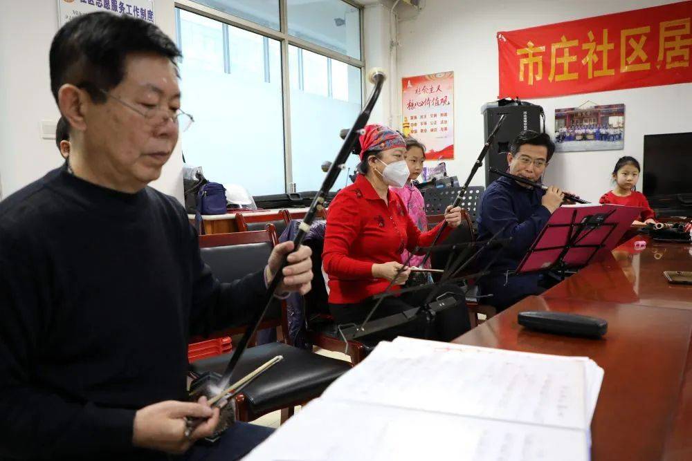 ↑1月9日,在石家庄市市庄社区居委会群众活动中心,音乐家张勇(右二)在指导文艺爱好者练习民乐演奏。新华社记者 骆学峰 摄