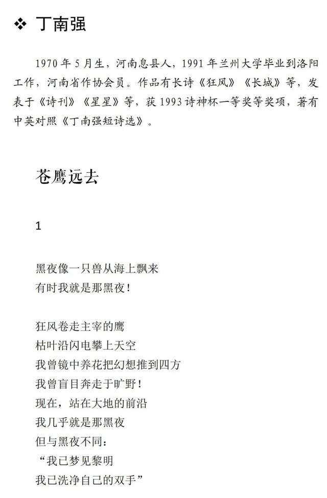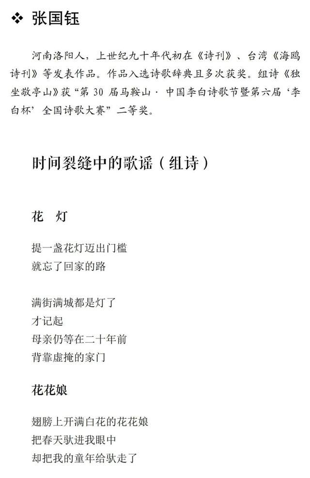 编者按:本期【九州风雅颂】编发的是陈昌华主编《诗路花语——洛阳七十年诗歌选》收录的1990年代诗人杨志学 、长笛手、丁南强、葛先龙、李宝琪、张国钰、赵希斌、王青寅、刘胜利、胡忠阳的诗歌代表作,敬请欣赏。欢迎您关注《九州风雅颂公众号》更多精彩!