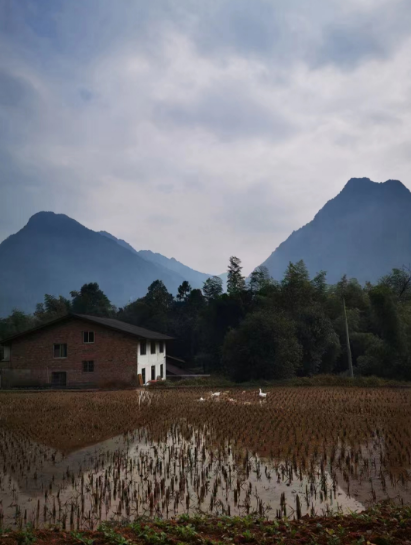 黛瓦灰墙掩翠微,田间鸭戏鸟纷飞。