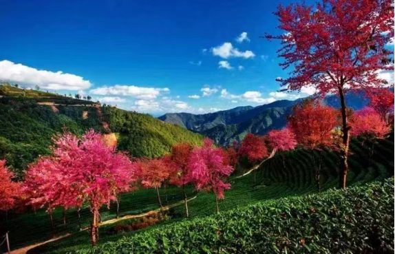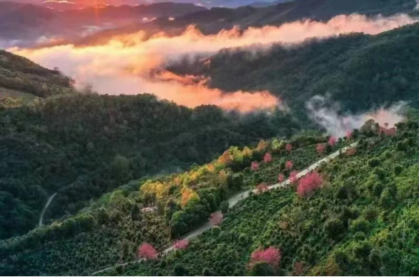 茶垄葱葱不染尘,夕阳西下众山茵。