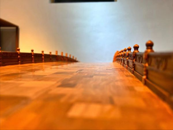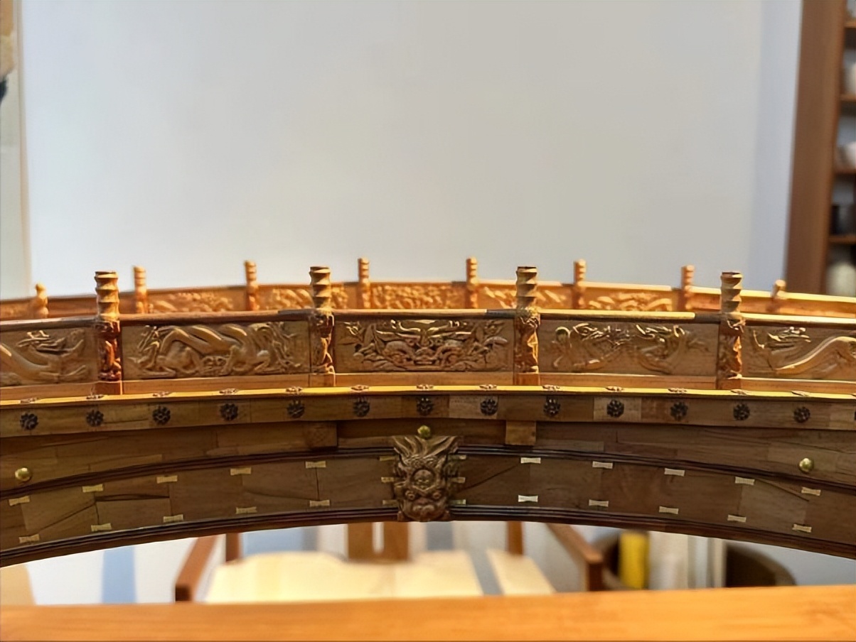 木工匠人傅星卫介绍说:“我的家乡在河北省平山县,从小就喜欢木工技艺,一干就是一整天,也不觉得累。此次制作微雕木制赵州桥,为了能保证微缩赵州桥的真实复原,除了参考大量的文献记载和大量搜集图片外,我们还多次前往赵州桥景区实地测量尺寸和拍照,微缩赵州桥的材质选用的就是赵县的雪花梨木。制作共用时4个月的时间。微缩赵州桥是纯手工按照传统的木作榫卯工艺来还原赵州石桥的制作工艺,并从中体会中国智慧——榫卯,在石块上的运用和升华;比如:桥体的收分,桥身上铁拉杆、勾石、腰铁的运用无不是得益于中国传统建筑榫卯的启示,对石桥的坚固和牢靠起到了至关重要的作用。桥面上的围护结构——栏板,尤其是栏板和望柱上56条神态各异的蛟龙,是一幅幅手绘出来,纯手工雕刻而成。”