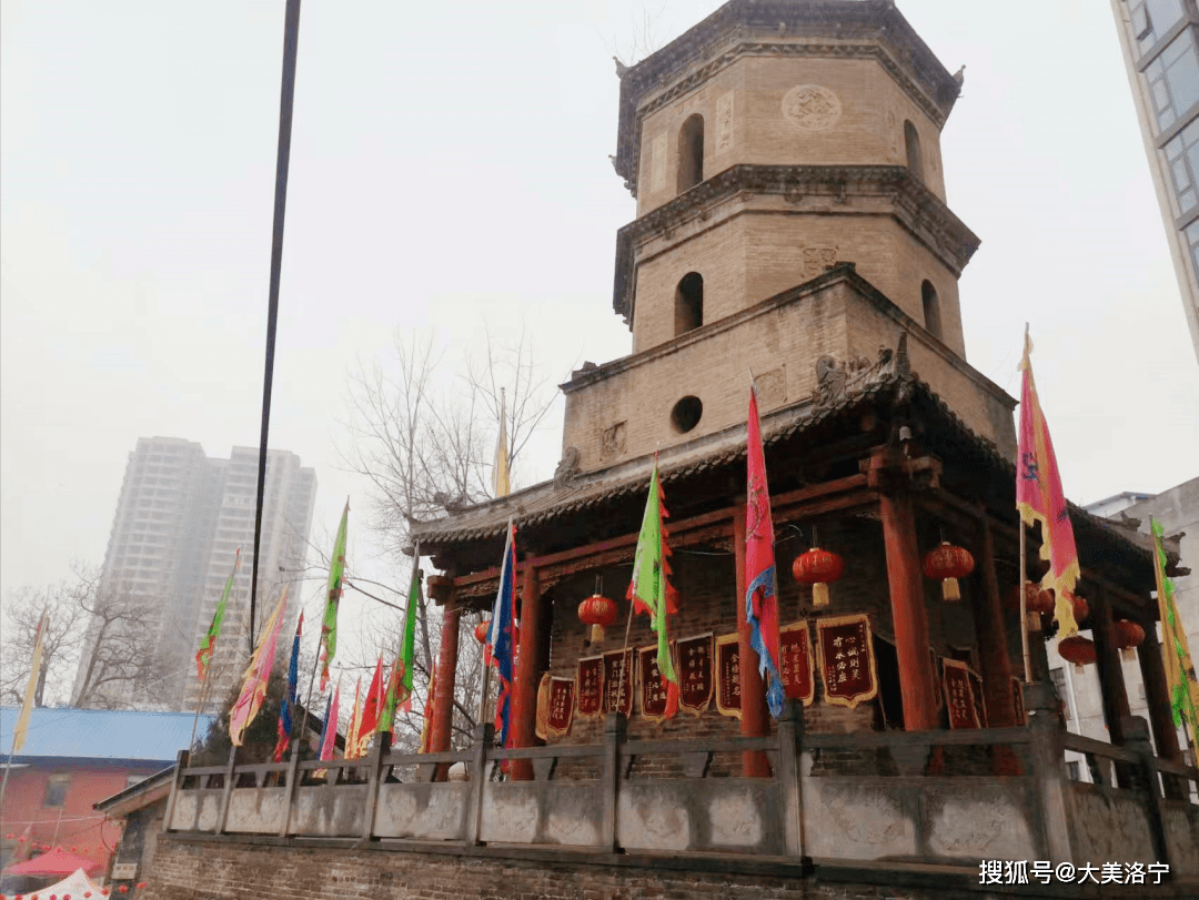 聚魁楼位于洛宁旧城东南角,据旧县志记载:原址在文庙东,于明万历二十四年迁往城外涧河以东,后又于万历三十五年迁入现在的位置。我们现在看到的聚魁楼,主体是清顺治十四年在原址上再次重建的。聚魁楼高四层,下两层为四方体,外有梁柱飞檐,上两层正为八棱八面,上面锥顶。聚魁楼建于两米多高的台基之上,青砖结构,楼上前后楼各门洞,各面对称,有砖雕艺术图案,整体造型优美、高大雄伟,是明清古建筑艺术之精品。
