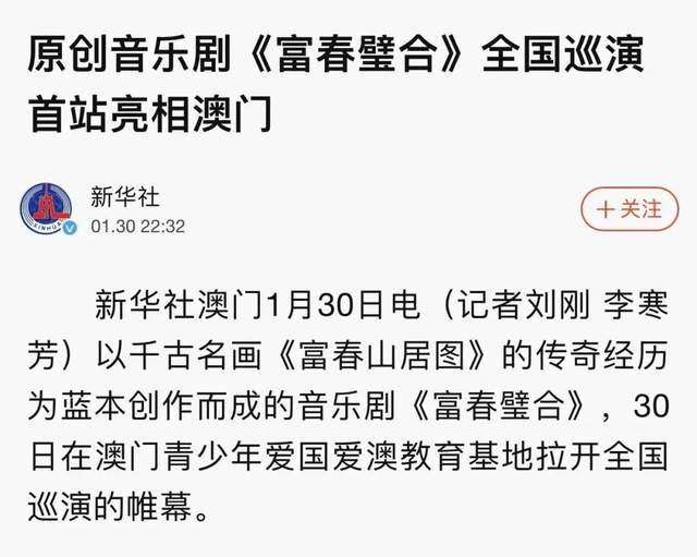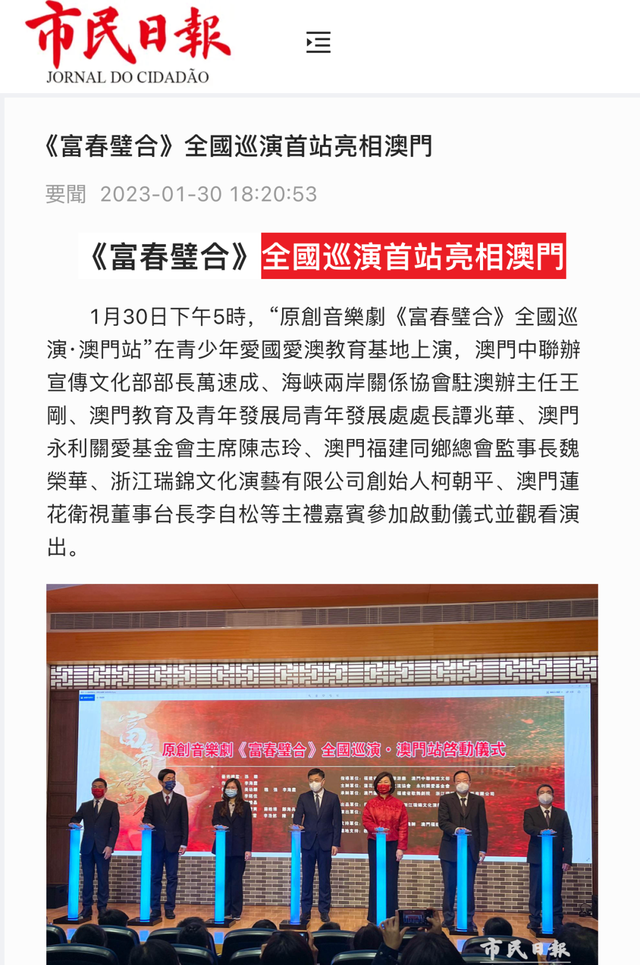 2023全国巡演澳门站演出圆满成功,在线上线下都引发热烈反响。新华社、新华网、人民日报海外网、澳门日报、市民日报、濠江日报、莲花传媒、大湾区时报、福建大剧院官方公众号等多家权威媒体对《富春璧合》澳门站的演出进行报道。