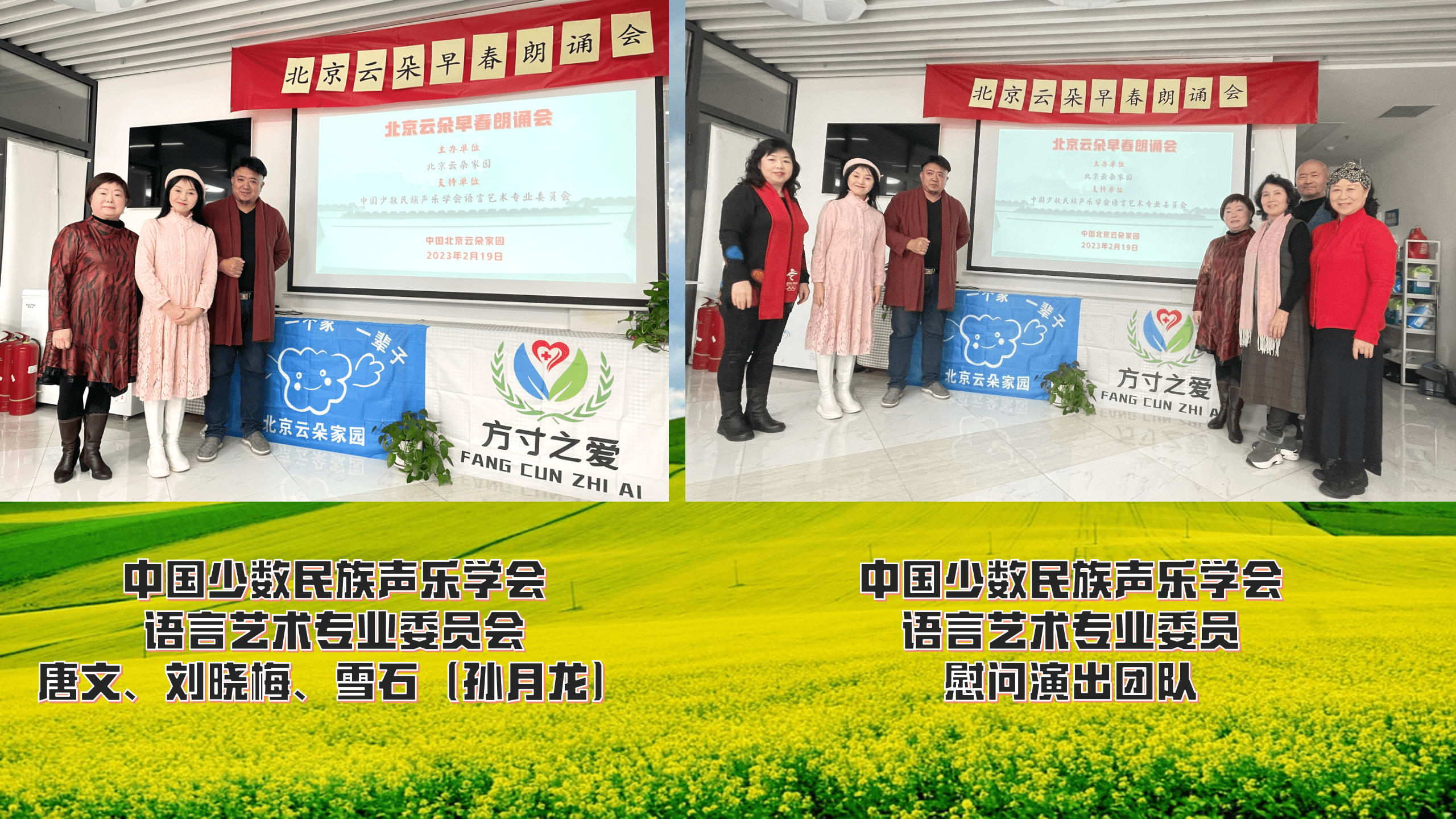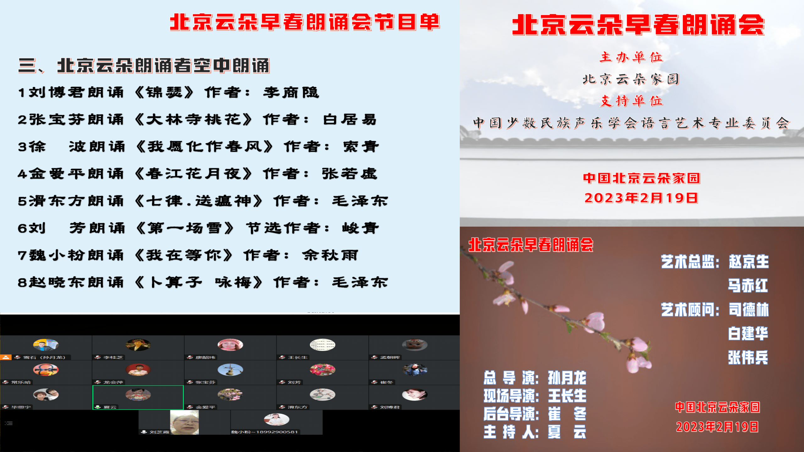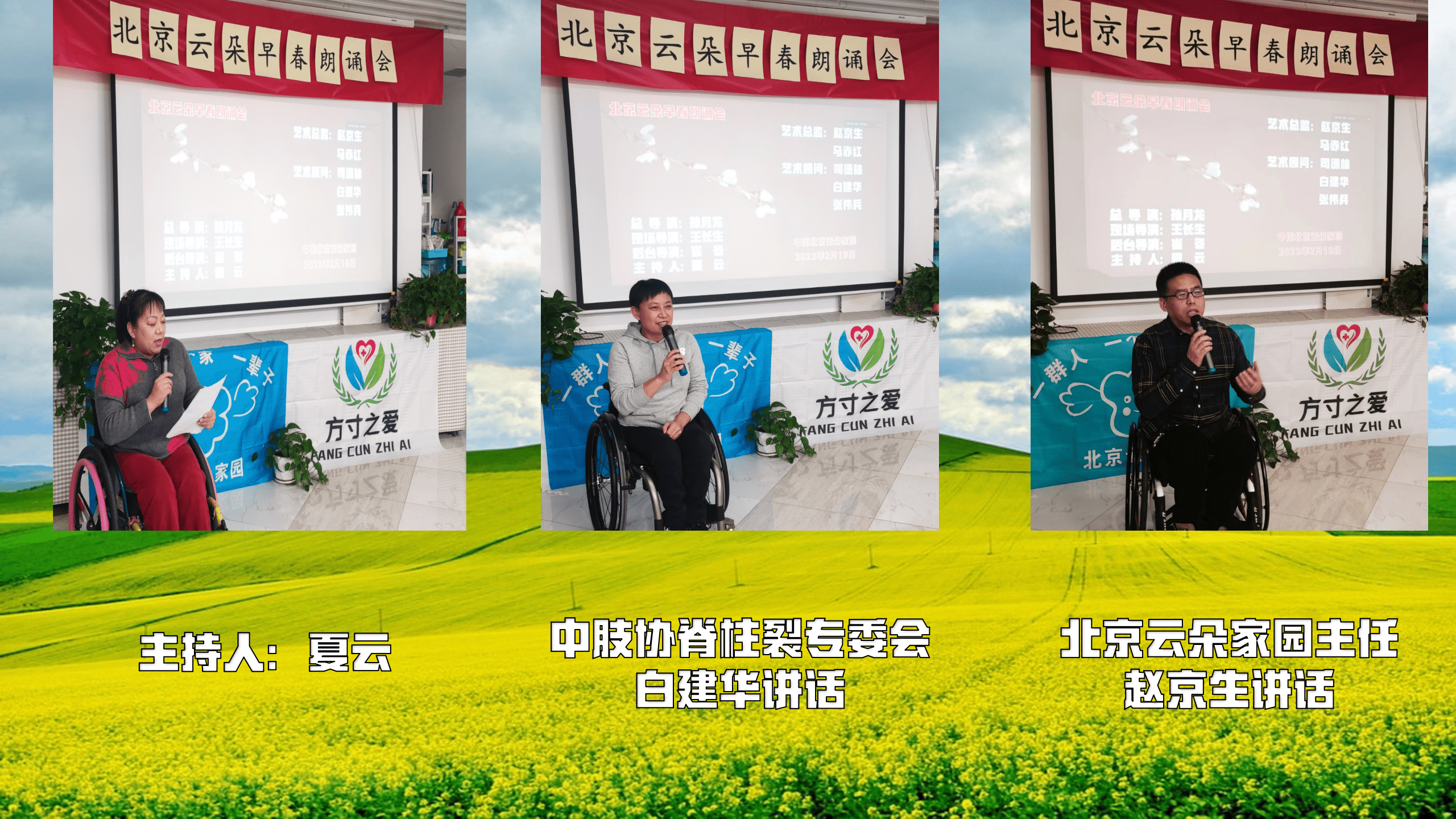 (央影音讯)2023年2月19日下午,北京市肢协云朵家园在东城区金鱼池温馨家园内,成功举办了北京云朵早春朗诵会。来自全国的北京云朵朗诵班的17位残障朗诵者进行了精彩诵读。中国少数民族声乐学会语言艺术专业委员会7位朗诵者走进北京云朵家园参加朗诵会。中国肢残人协会脊柱裂专委会副主任白建华、北京云朵家园主任赵京生先后讲话对朗诵会的召开表达了祝贺,肯定了成绩,提出了期望。朗诵会由夏云女士主持。