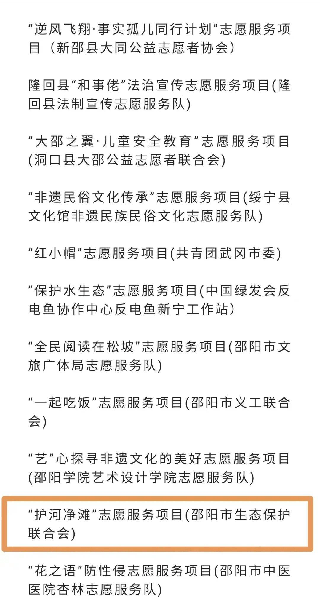 2月21日,《文明邵阳》公众号发布邵阳市2022年学雷锋志愿服务“五个一批”先进典型名单,邵阳市绿色卫士大队"护河净滩"志愿服务项目赫然在目,荣获该市2022年最佳志愿服务项目奖!
