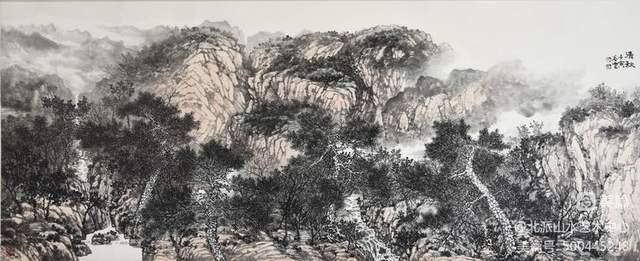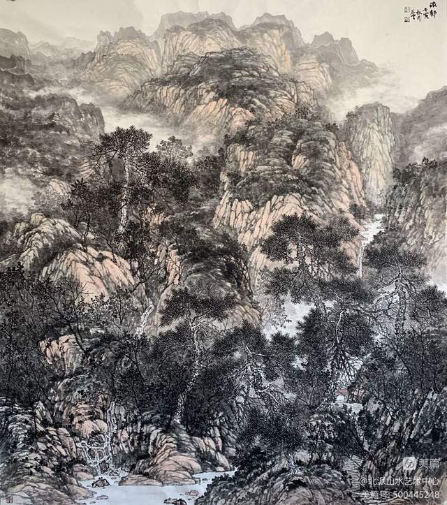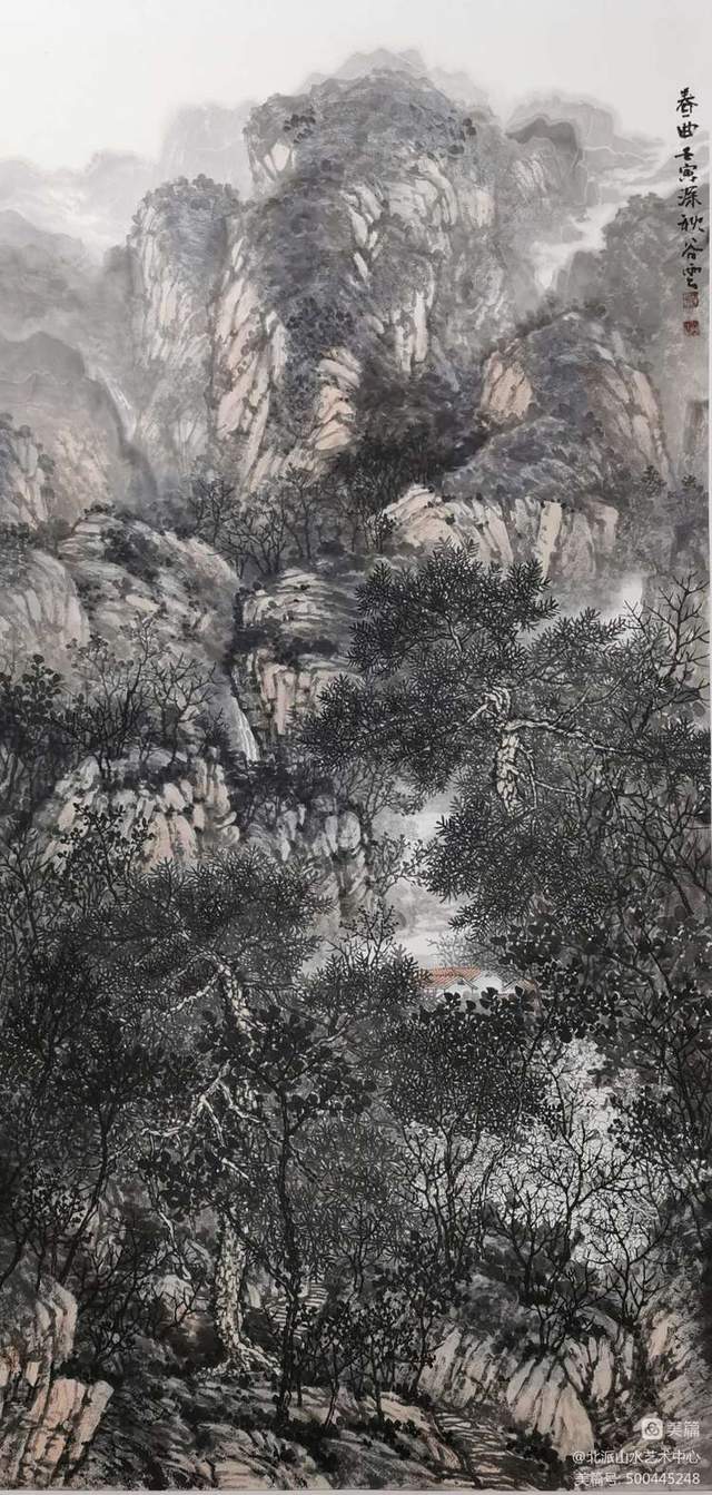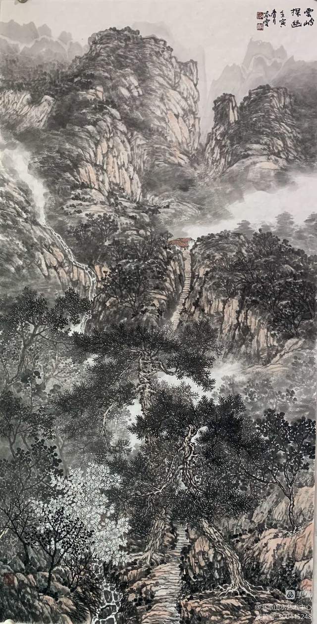 画家彭谷云,其作品受师恩钊,段铁两位老师影响颇深,流露出一种质朴,严谨,俊雅之气。其山水画趋向于“繁密”的风格,用笔的书写性和灵活多变的皴法,使景色郁然深秀又不失清幽。沉稳的线条严守山石树木的结构变化,奔放有法度,变化有风采。笔笔生发、洒脱健劲的勾与皴,表现或恬静柔和的祥云飞瀑、或气势磅礴的风云变幻。冷峻的笔力提炼山峰树木之形神,侧锋皴擦山石结构质感,或施淡墨、或赋雅彩,色调明润,变化有序,在抒写胸中天地的同时,宾主分明气韵相通,合乎自然规律性,浑厚华滋,尽显飘逸之趣。