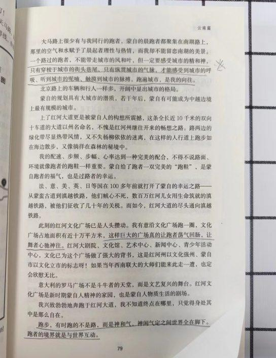 在阅读中,我甚而打开了网络地图,对照书中内容去查阅;甚而有些时候,我仿佛看到了一个人,他在黎明中迎着霞光奔跑;或不惧风雨,沿河奔跑;或忍着膝痛旧疾奔跑;或抵抗着高反,跌跌撞撞地奔跑。跑者的精神和毅力令人感佩!